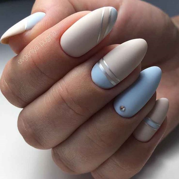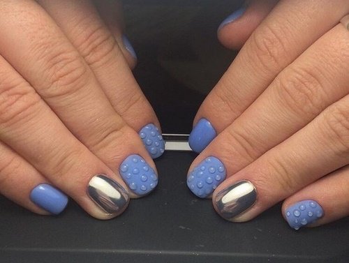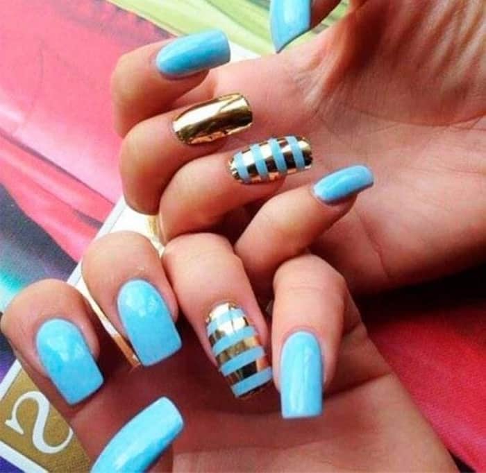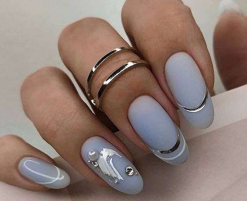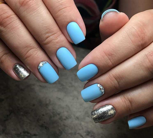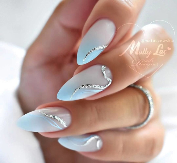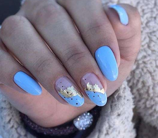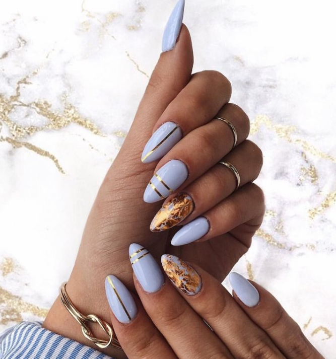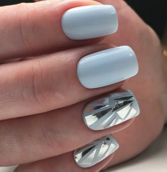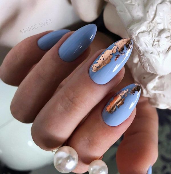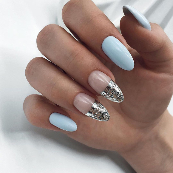 Серебро и золото — благородные металлы на ногтях. К небесному одинаково здорово подходят оба цвета. Вы можете оформить отдельные ноготки или нарисовать незамысловатые рисунки на базе (полоски, фигурки, вензеля, кружево) — все зависит от настроения и повода.