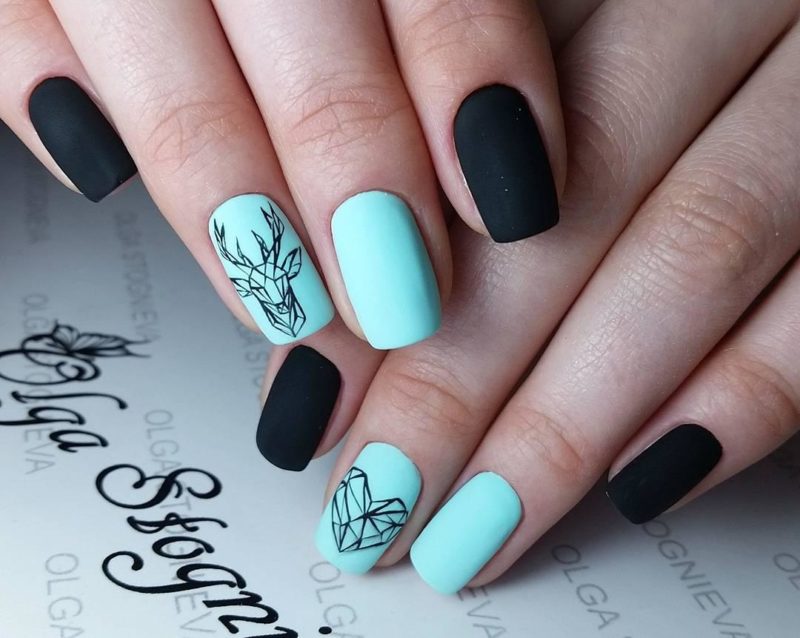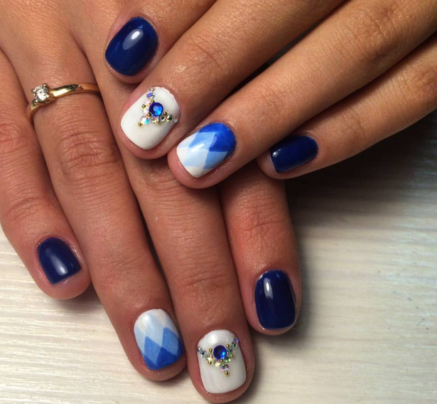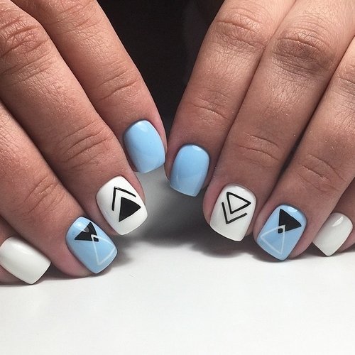 Это сочетание цветов словно задумано природой — небо и облака, море и пена. Это летний и зимний тандем. Для первого варианта подойдут более теплые насыщенные тона, а вот для зимнего стоит выбрать ледяные прозрачные. На их фоне белоснежные снежинки или вязаный дизайн будут смотреться очень эффектно.