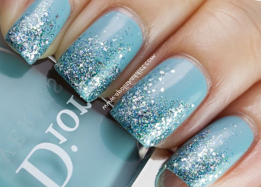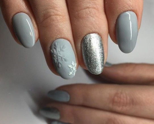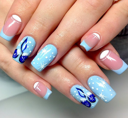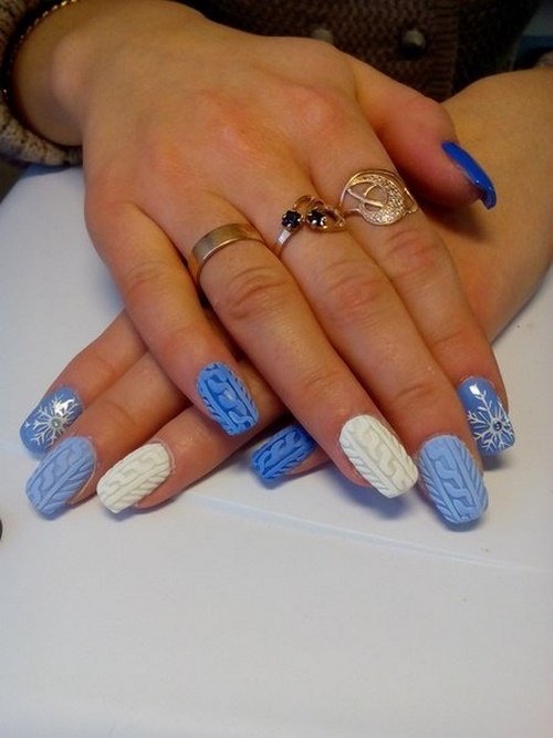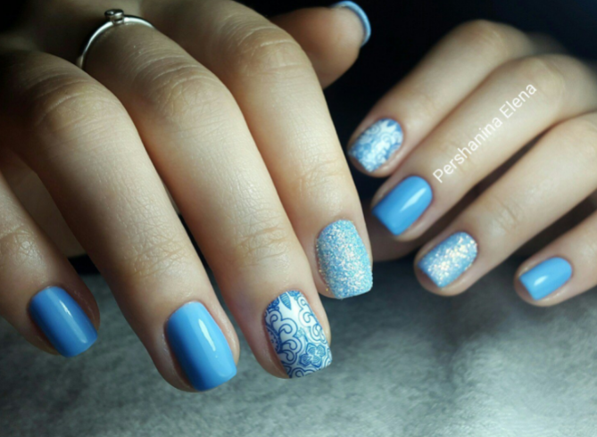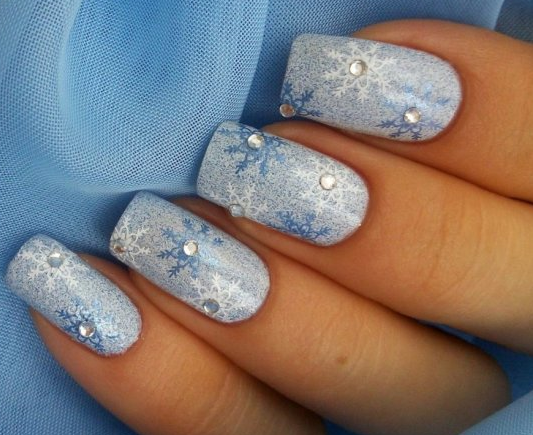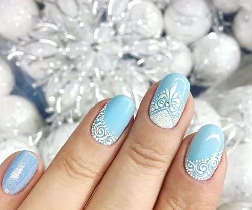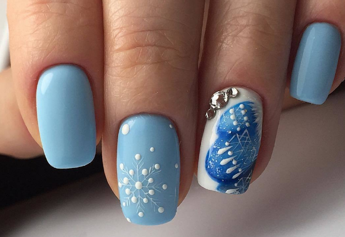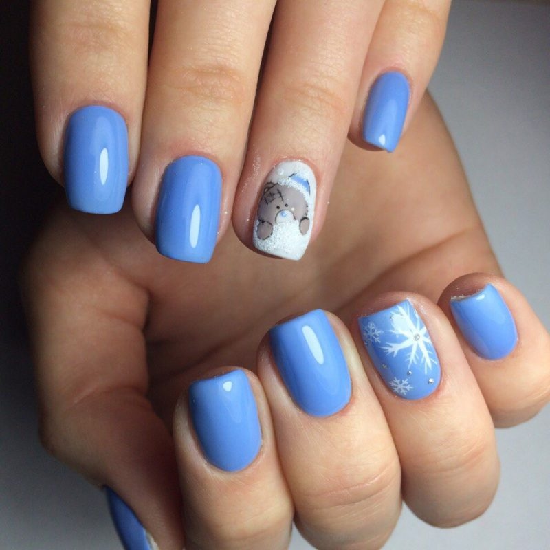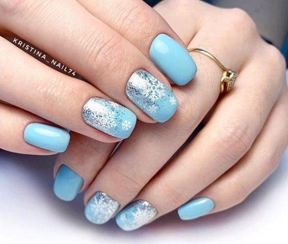 Как создать на ногтях зимнюю сказку без голубого цвета? Конечно, никак. Зимой актуальны почти все тона, входящие в палитру. Ну а стразы, блестки, наклейки, блестящие втирки и фольга помогут придать блеска и настроения маникюру.