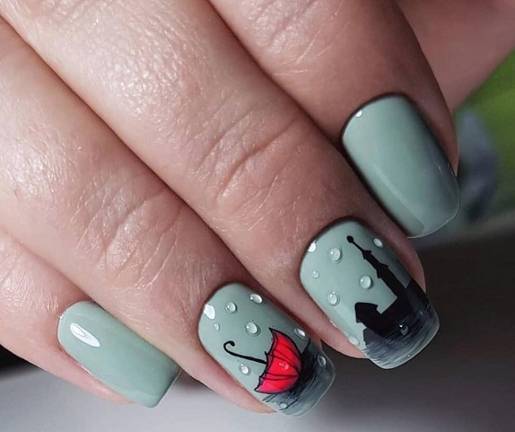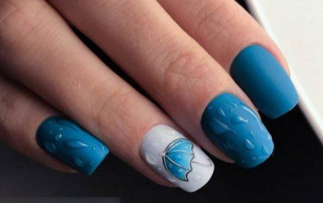 Осень может быть разной — серой и промозглой или яркой оранжево-бордовой. Здесь подойдут самые темные оттенки голубого цвета. Дизайн — градиент, капельки дождя, негативное пространство, фольга, стразы.