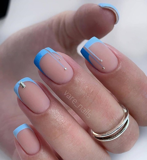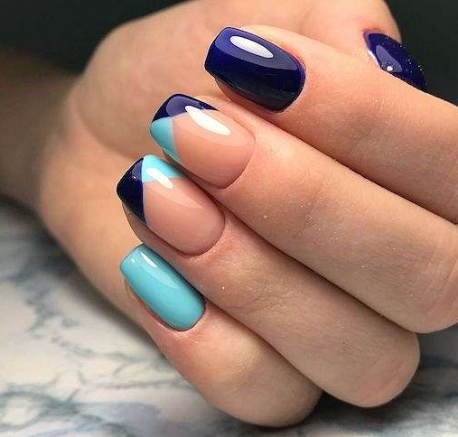 Французский маникюр — бессменный лидер любого сезона. Классический вариант дизайна ногтей уже давно не имеет никаких рамок. Очень эффектно смотрится вариант треугольного френча с разноцветными полосками на краю пластины — это могут быть два оттенка голубого, контрастные цвета. Дизайн френча ограничен исключительно вашей фантазией.