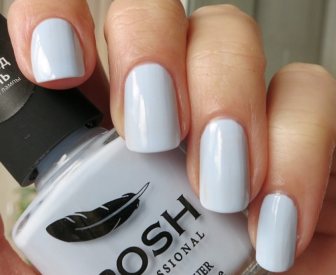 Небесный оттенок лака подойдет обладательницам всех цветов кожи. Он станет прекрасной базой для любого дизайна, а сочетать нежный пастельный цвет можно практически с любым из основной палитры.