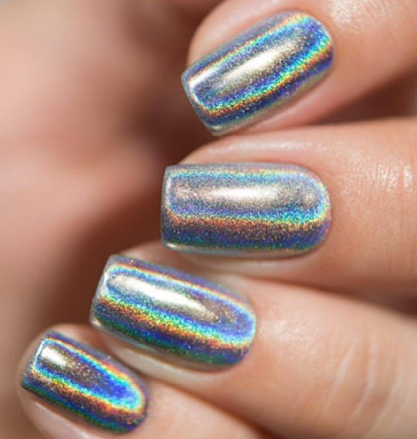 Фольгированные тонкие листики металлов разных цветов — отличный способ декорировать ногти. С помощью фольги можно полностью закрасить пластину, словно на нее нанесли металл схожего или контрастного цвета. Кроме того, кусочки фольги можно кисточкой нанести на ноготки и закрепить лаком.