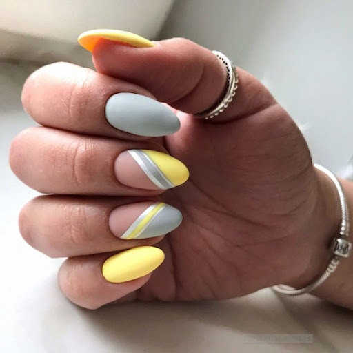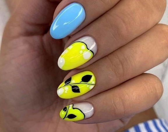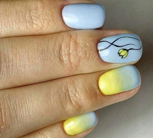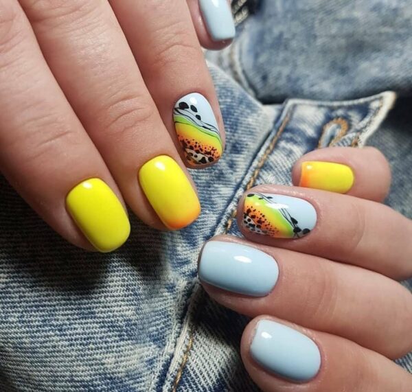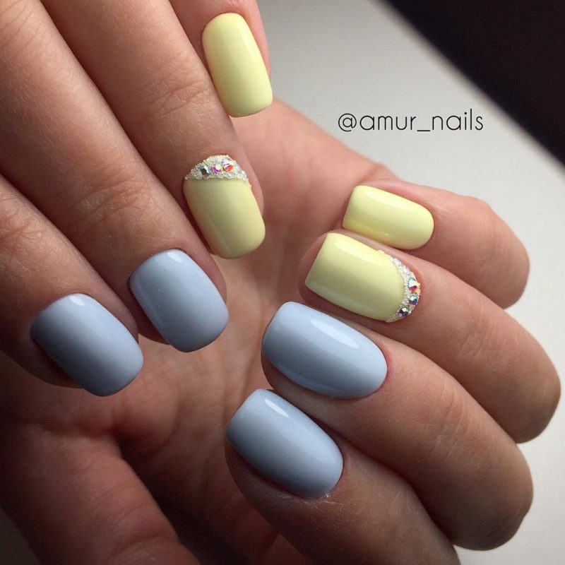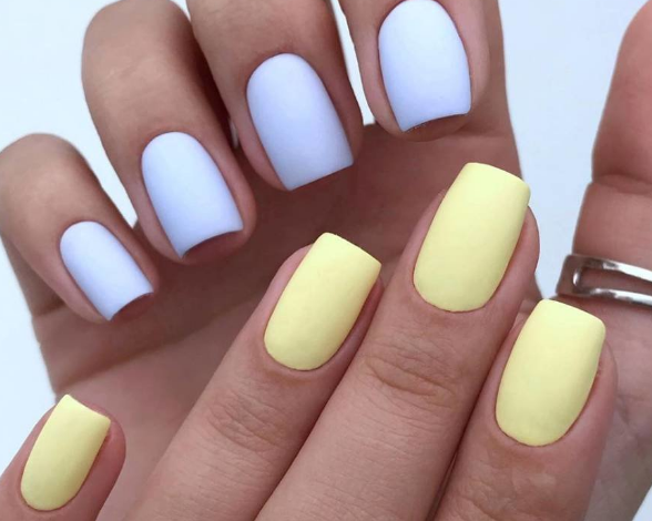 Нежно-голубой отлично “дружит” с ярким банановым — стоит нанести оба цвета в матовом исполнении.