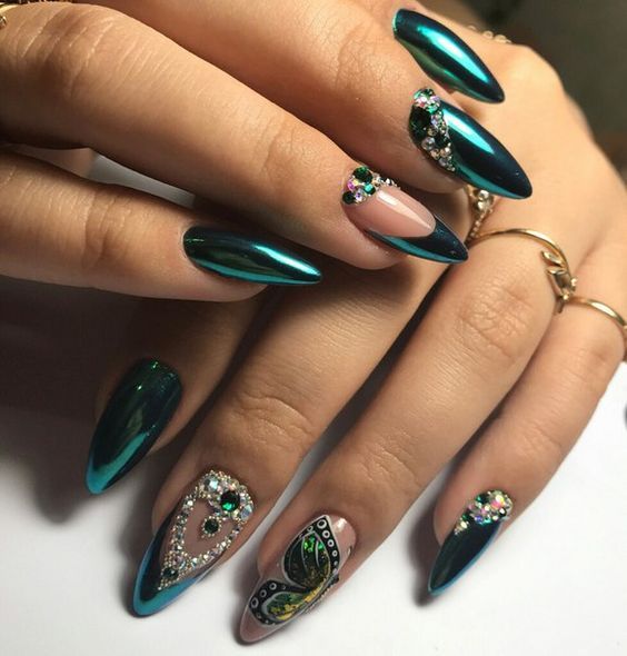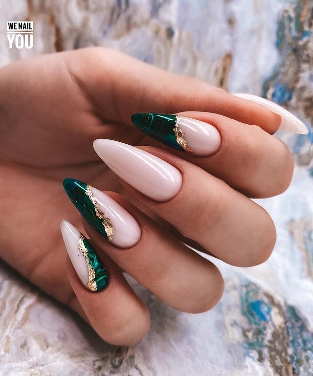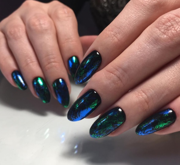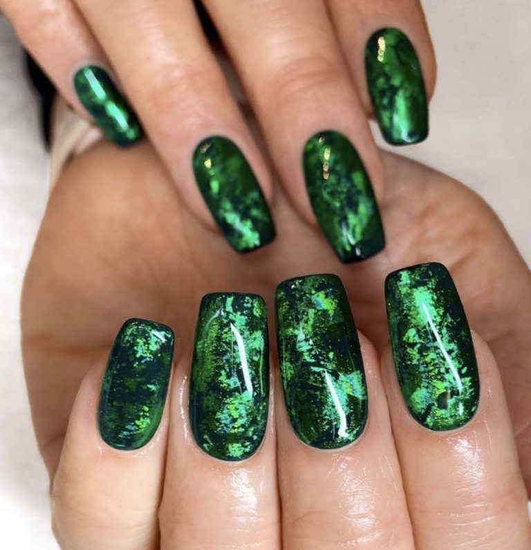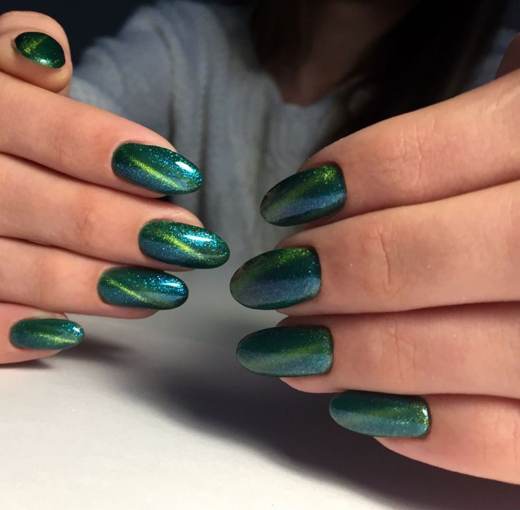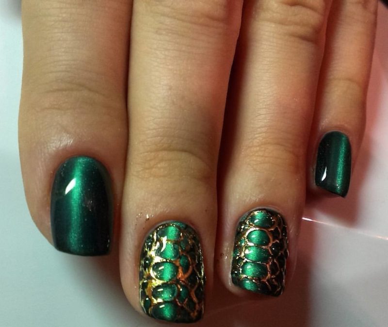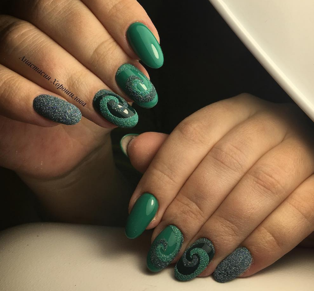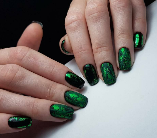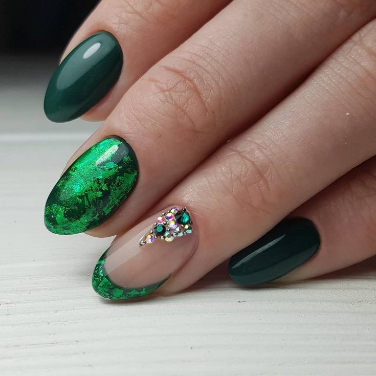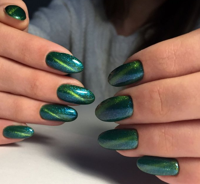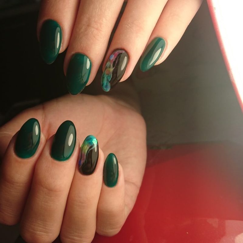 Изысканный изумрудный дизайн на овальных, миндалевидных или квадратных ногтях позволяет декорировать их геометрическим, растительным или фантазийным узором. Интересное решение – использовать технику голографии.