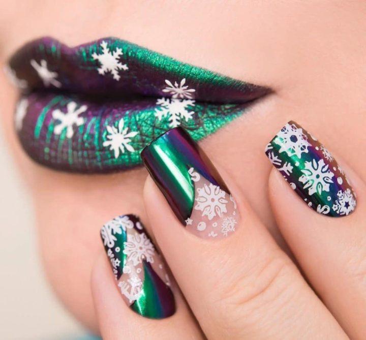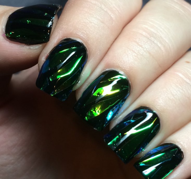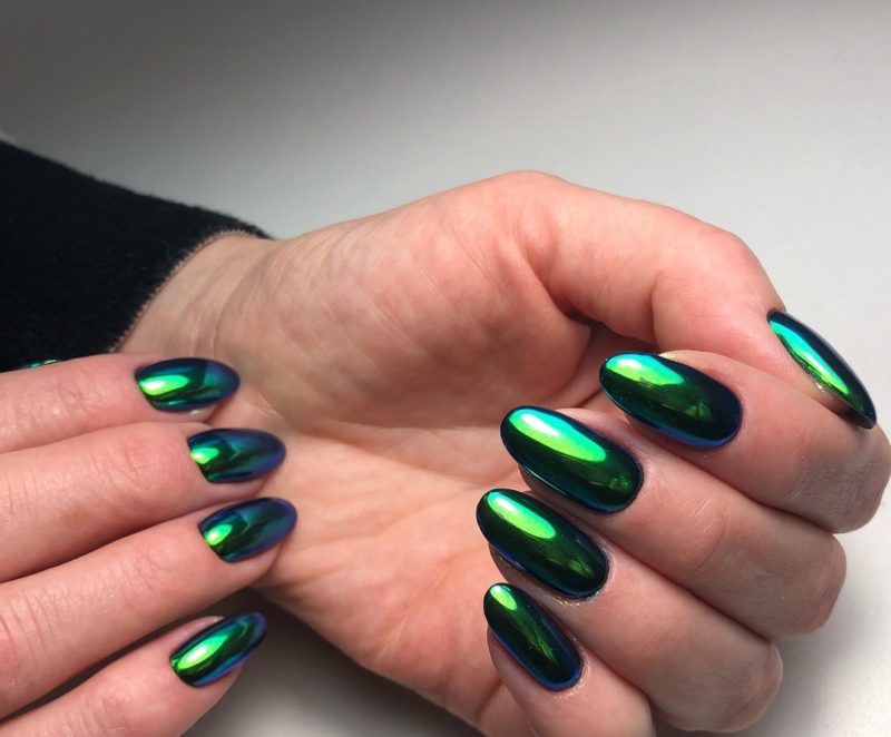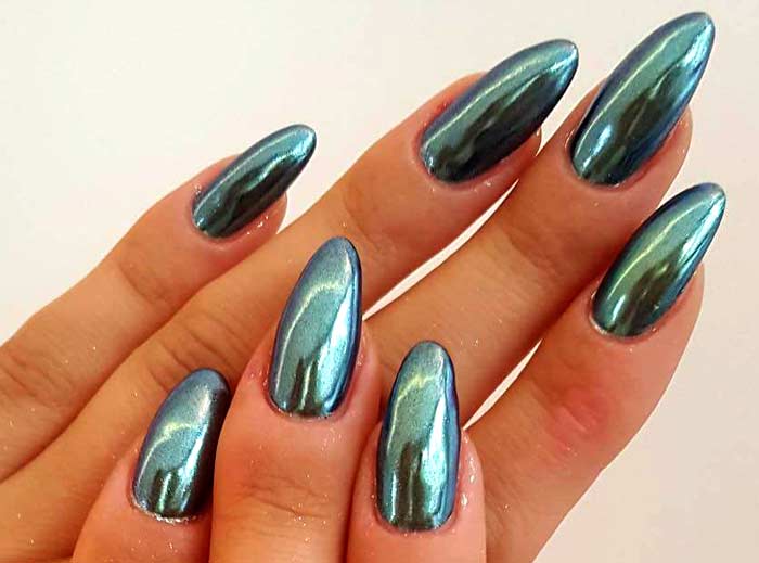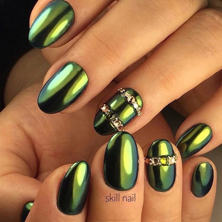 Эффектный праздничный блеск ногтей, напоминающий фольгу или зеркальное сияние, создает сочетание изумруда со специальным пигментом (акриловой пудрой). Преимущество заключается в том, что маникюр дольше держится и его легче снимать.