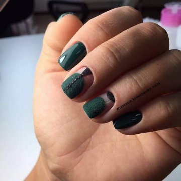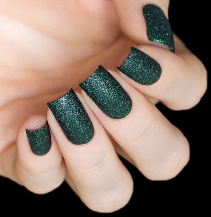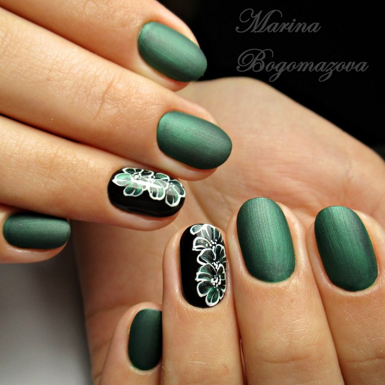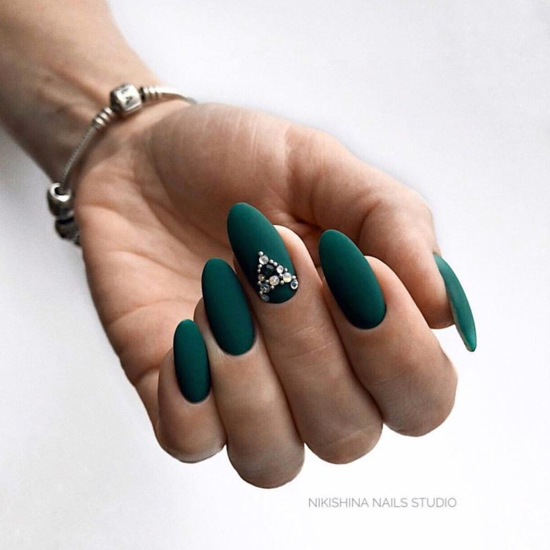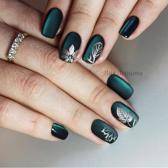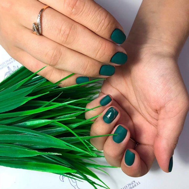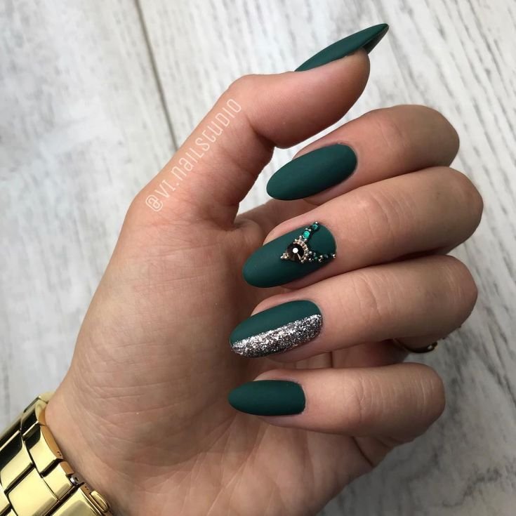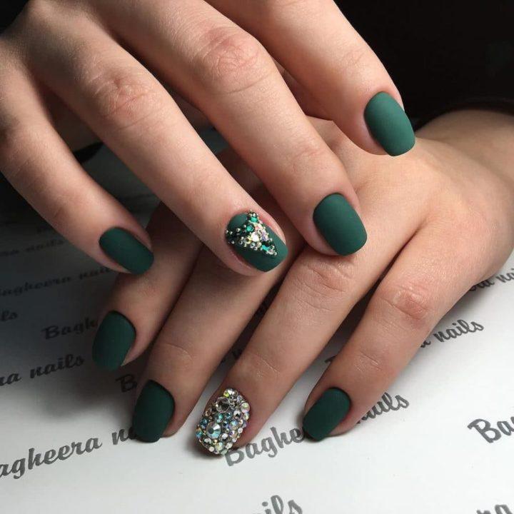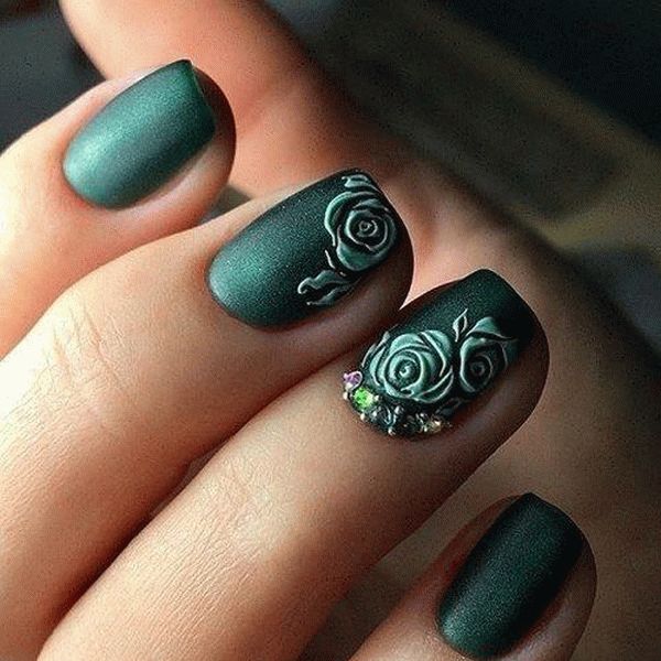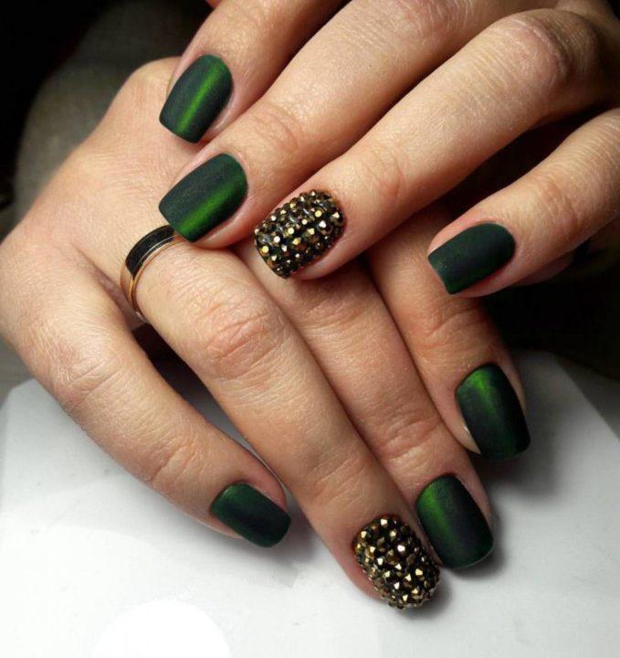 Благородный глубокий зеленый цвет безукоризненно гармонирует с бархатистым покрытием, уместным с вечерним и деловым образом. Однако такой дизайн не сочетается с чересчур броским нарядом. Темные матовые тона обладают изысканной глубиной и насыщенностью. Его можно слегка разбавить стразами, блестками, слайдерами.