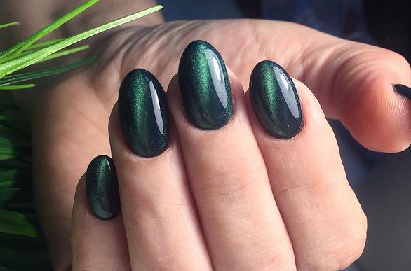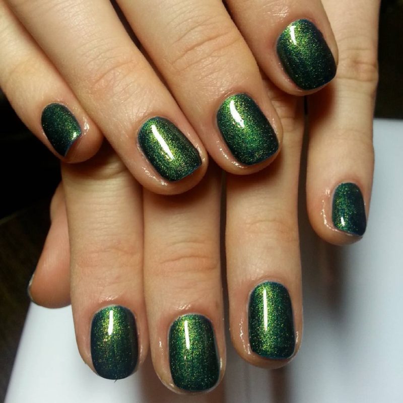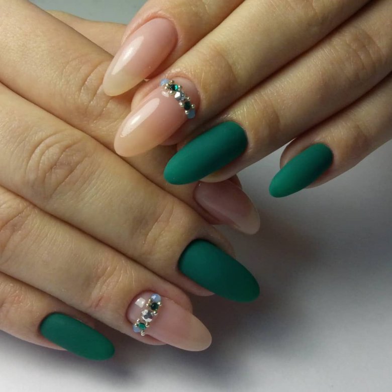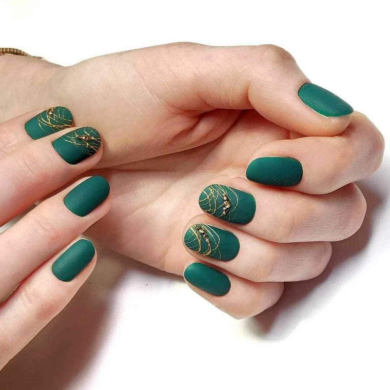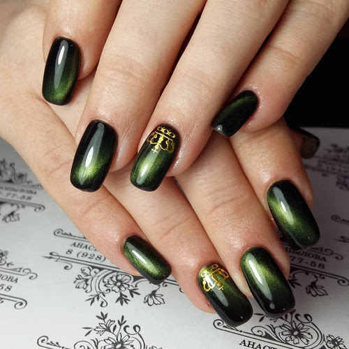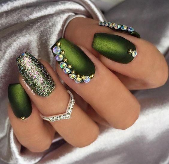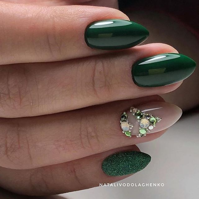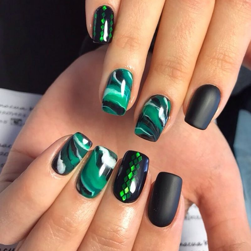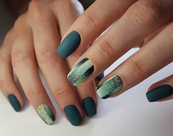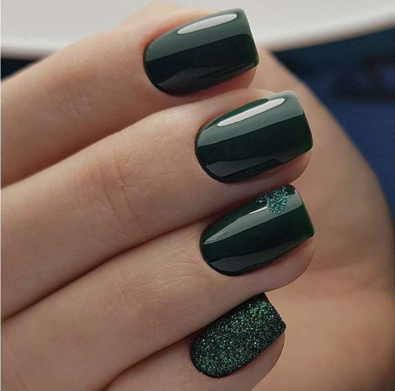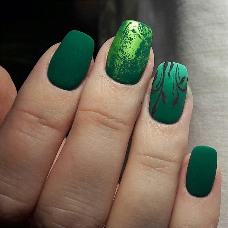 Благородный глубокий зеленый цвет безукоризненно гармонирует с бархатистым покрытием, уместным с вечерним и деловым образом. Однако такой дизайн не сочетается с чересчур броским нарядом. Темные матовые тона обладают изысканной глубиной и насыщенностью. Его можно слегка разбавить стразами, блестками, слайдерами.