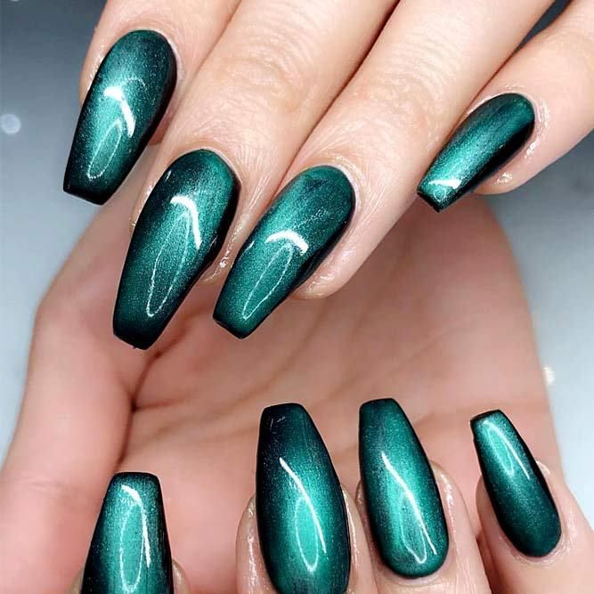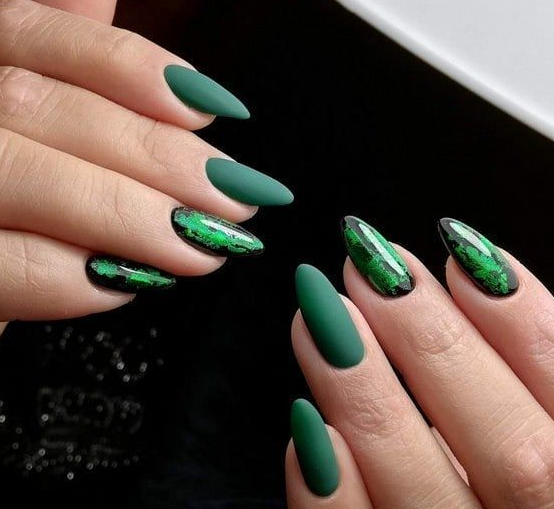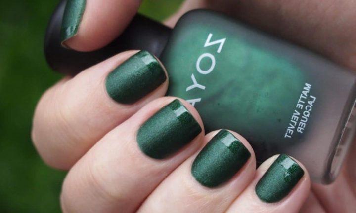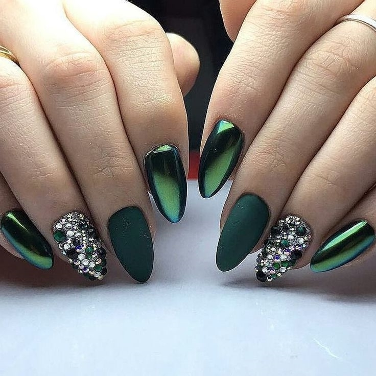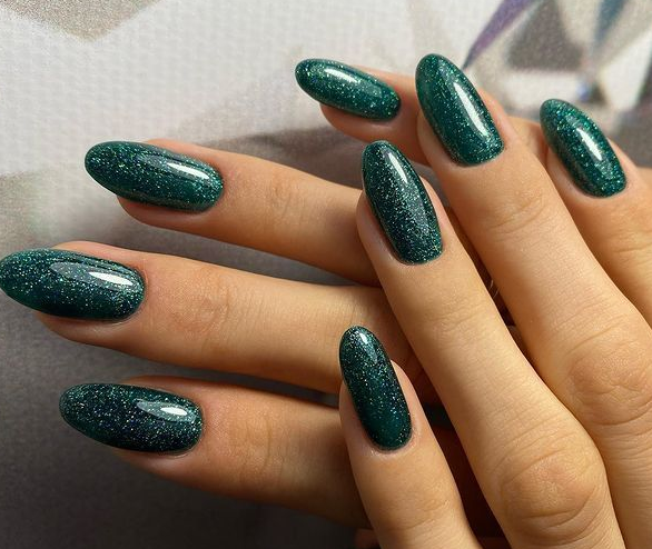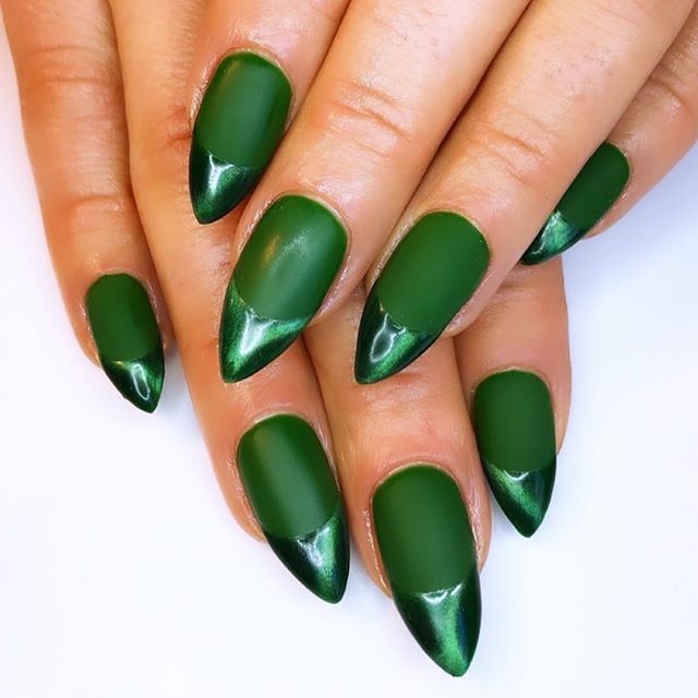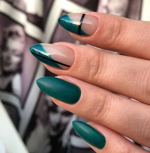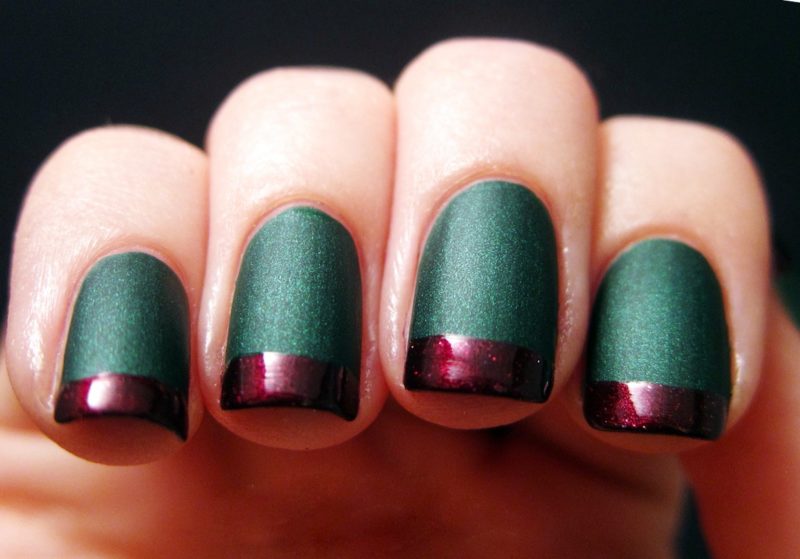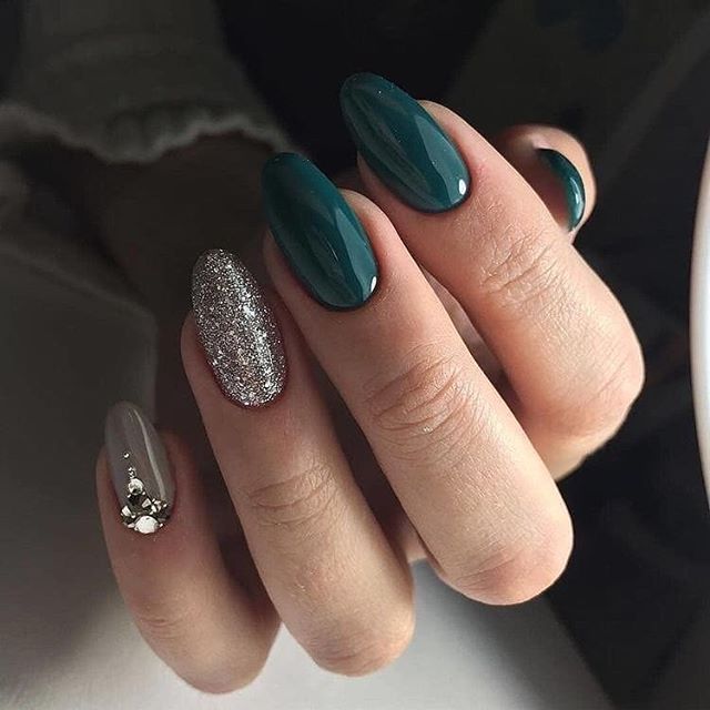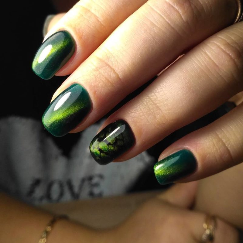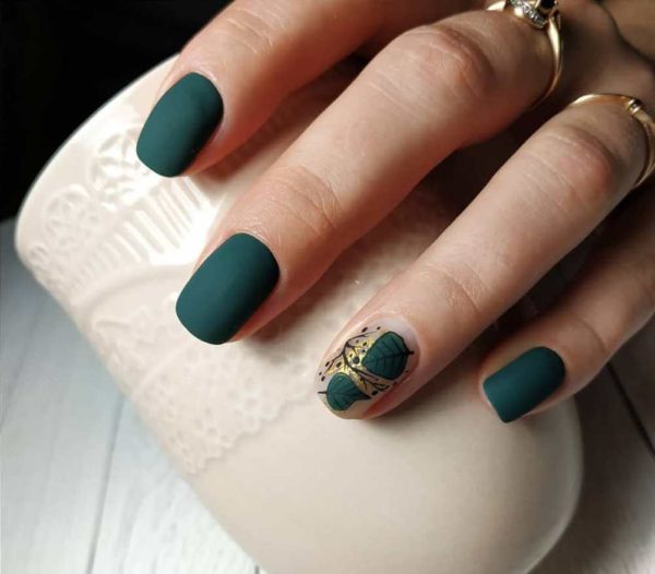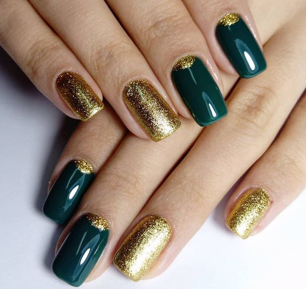 Благородный глубокий зеленый цвет безукоризненно гармонирует с бархатистым покрытием, уместным с вечерним и деловым образом. Однако такой дизайн не сочетается с чересчур броским нарядом. Темные матовые тона обладают изысканной глубиной и насыщенностью. Его можно слегка разбавить стразами, блестками, слайдерами.