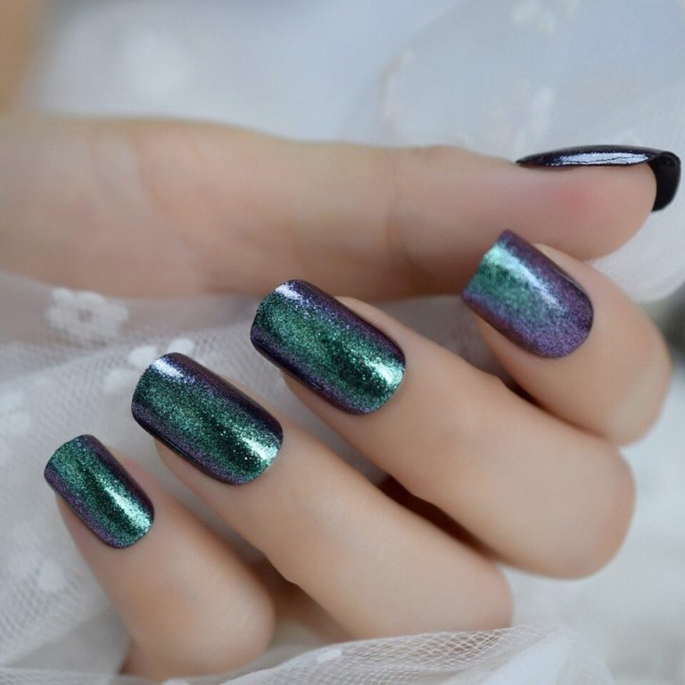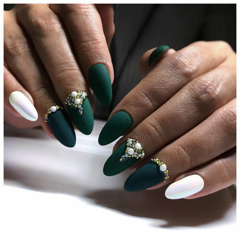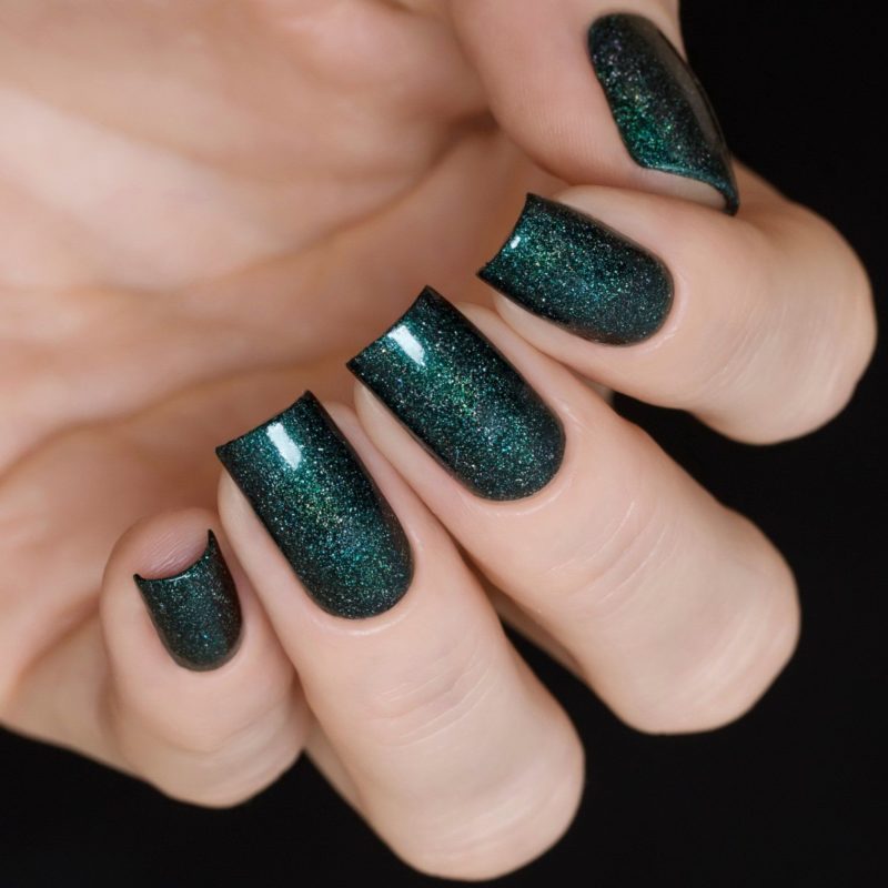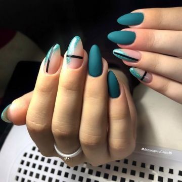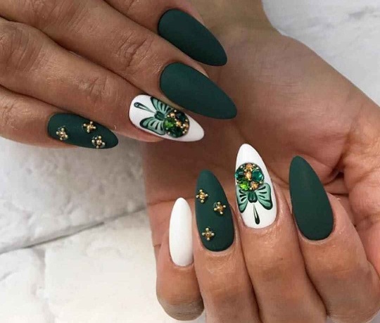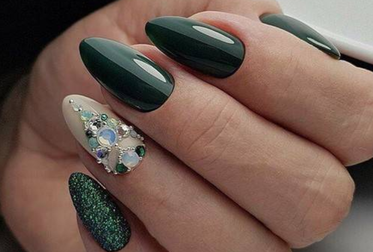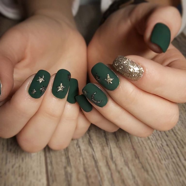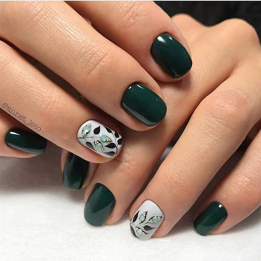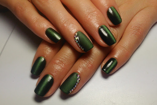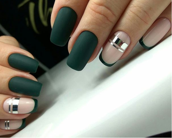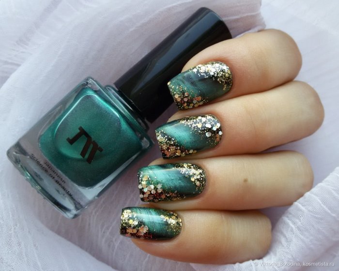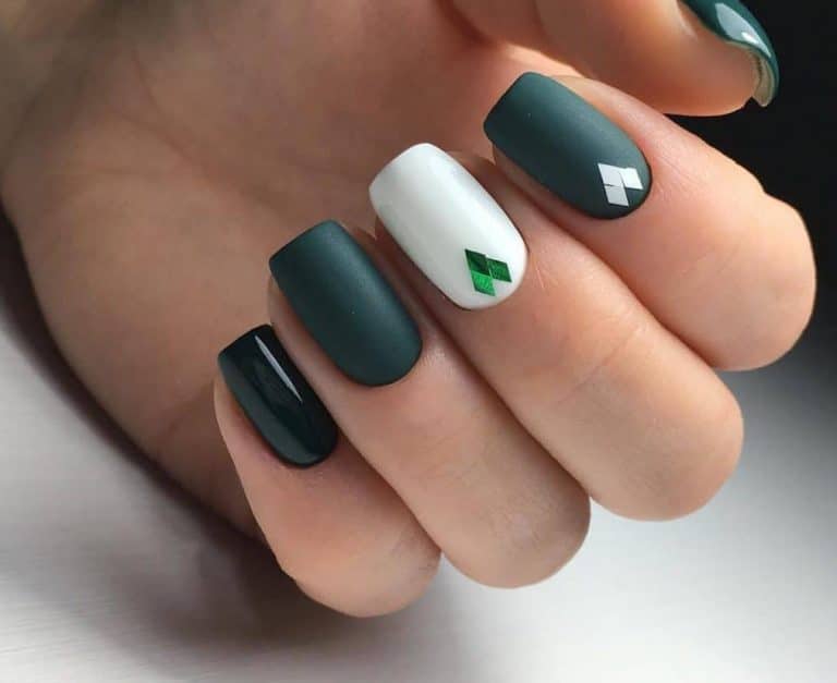 Благородный глубокий зеленый цвет безукоризненно гармонирует с бархатистым покрытием, уместным с вечерним и деловым образом. Однако такой дизайн не сочетается с чересчур броским нарядом. Темные матовые тона обладают изысканной глубиной и насыщенностью. Его можно слегка разбавить стразами, блестками, слайдерами.