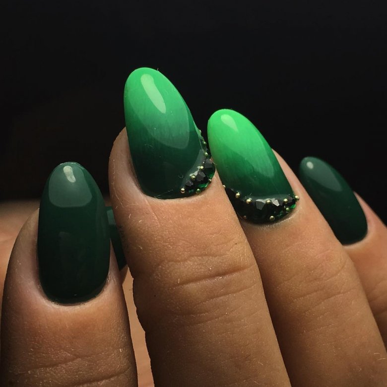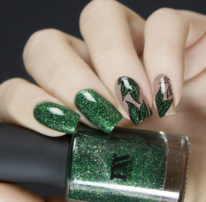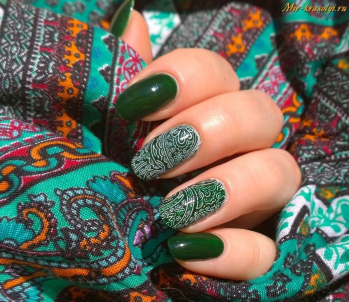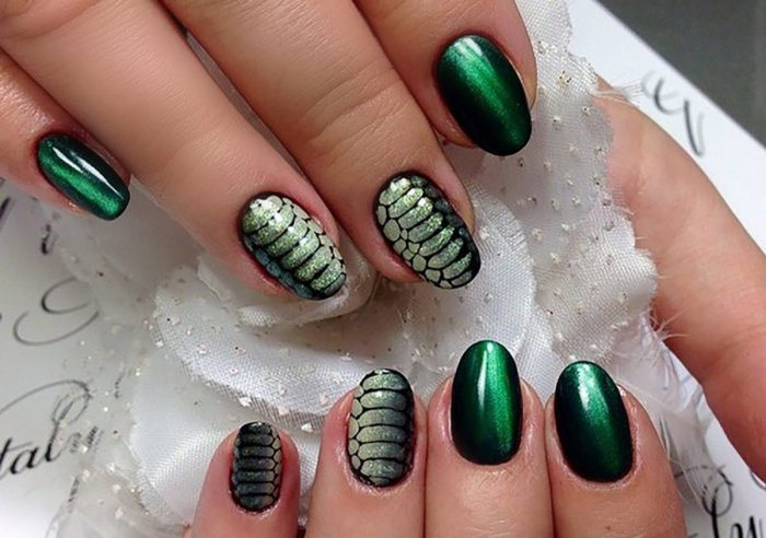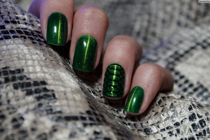 Любые оттенки густого зеленого лака (от малахитового до травяного) непроизвольно акцентируют внимание окружающих на ногтях. Поэтому к выбору декора следует подходить благоразумно. Оформление во многом зависит от типажа и длины ногтевой пластины.