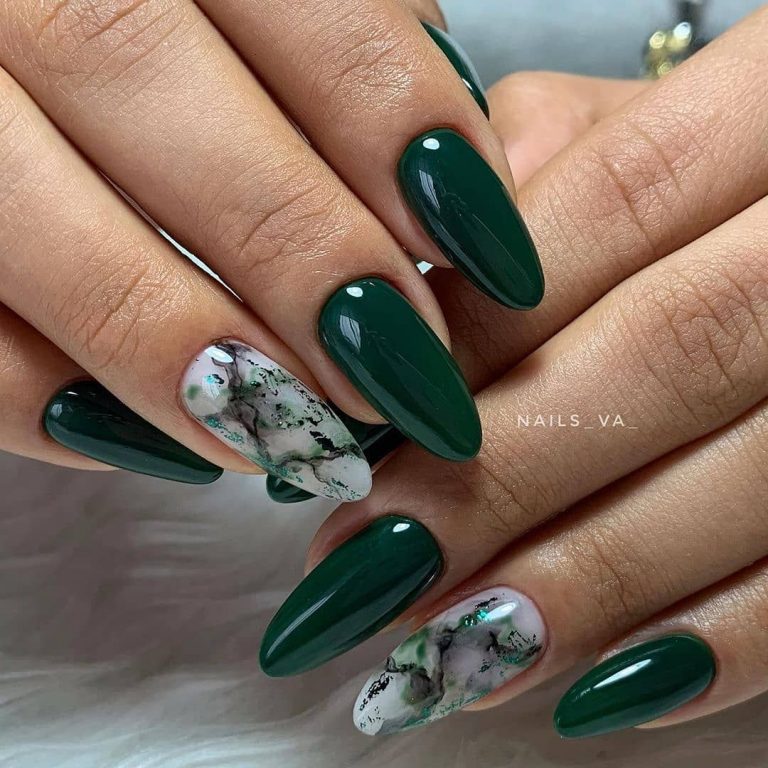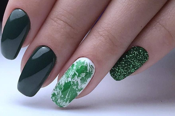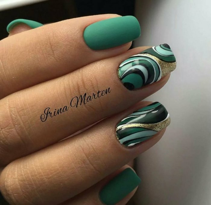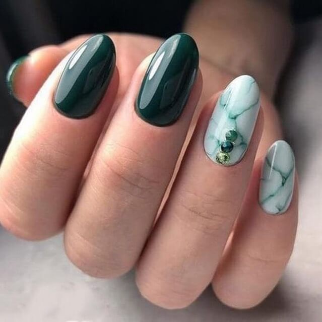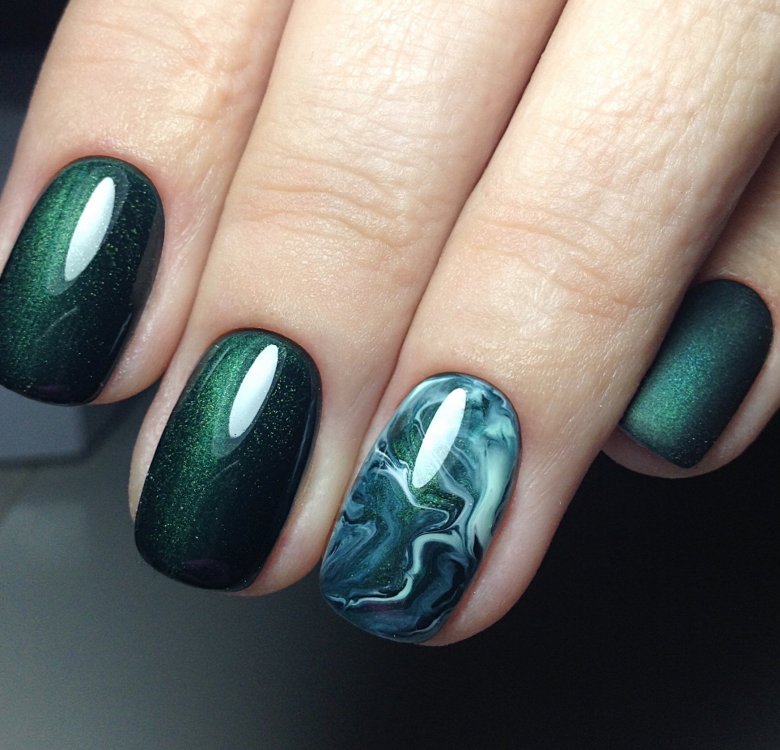 Многие женщины выбирают спокойный благородный вид мраморного дизайна с его холодным каменным шармом, дополняющим элегантный образ. Насыщенные зеленые оттенки удачно сочетаются с таким декором. Мастера обычно советуют использовать его на 1 или 2 пальцах, что позволит выделить модное оформление и одновременно сохранить баланс всего облика.