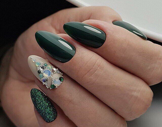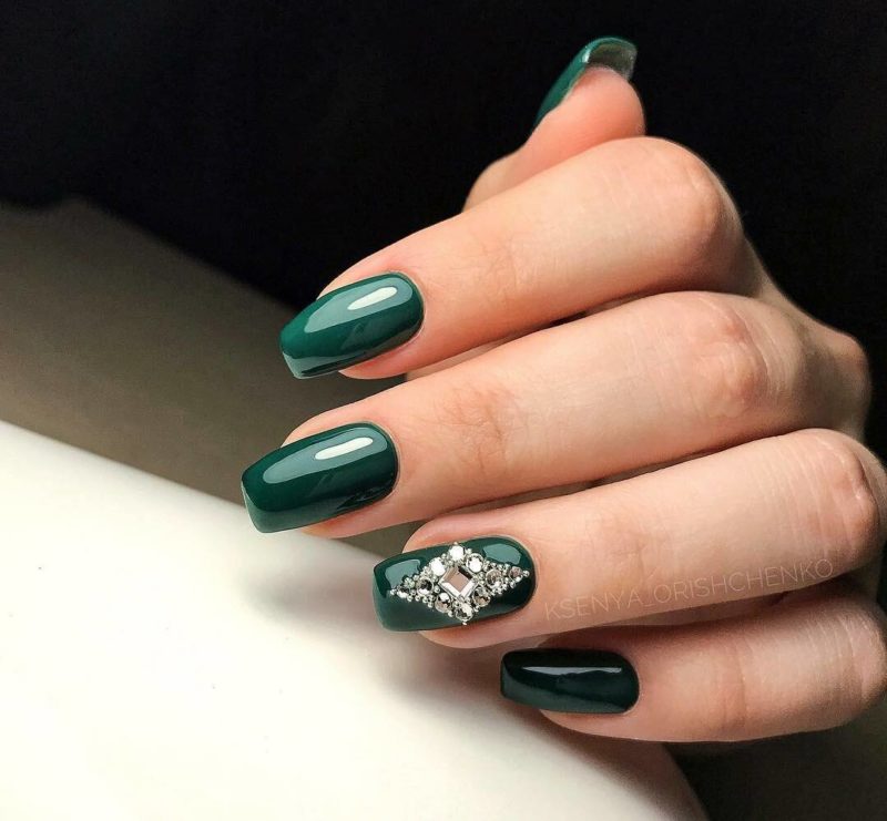 Важно: изумрудный маникюр со стразами станет главным акцентом в образе, поэтому следует соблюдать баланс в комбинации маникюра со строгой одеждой.