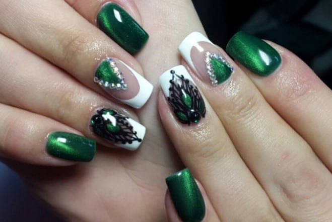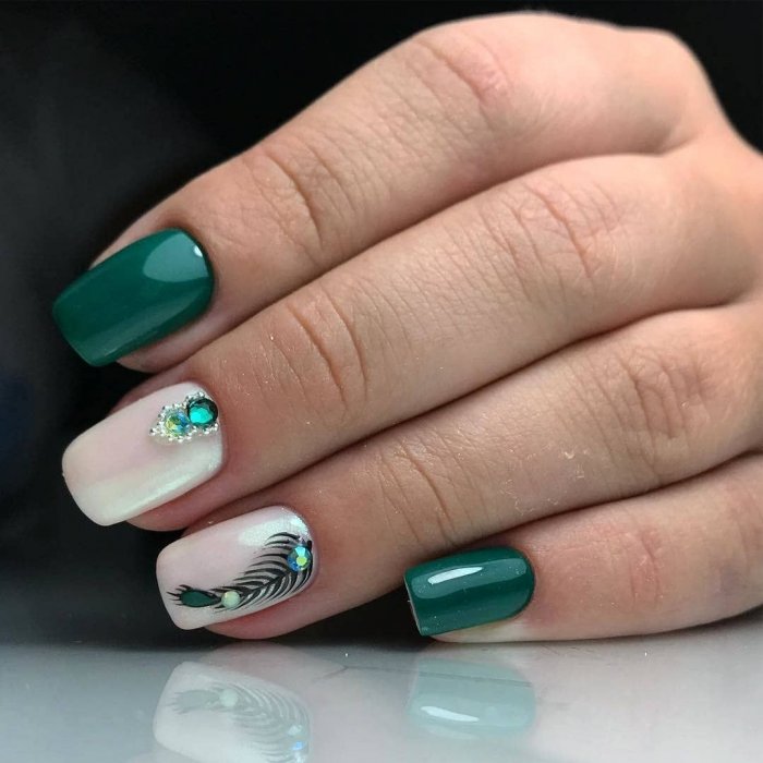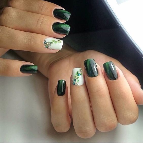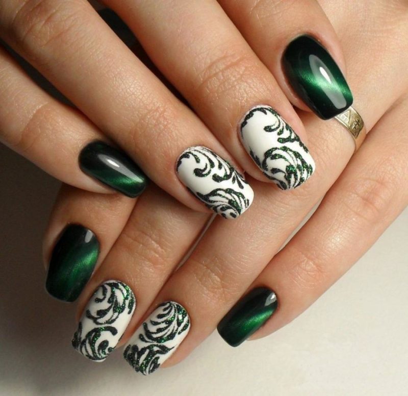 Модный тренд позволяет комбинировать ногти изумрудного цвета с белыми, черными, салатными, серебристыми, бежевыми тонами, а также с разнообразными популярными техниками отделки.