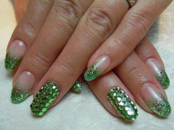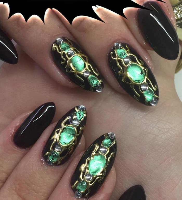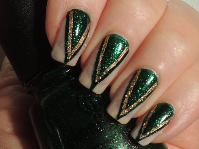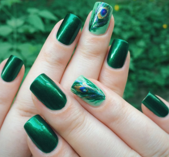Места для выполнения любого самого смелого рисунка здесь точно хватит. Изумрудный фон может сочетаться с ярким светлым рисунком, интересно будут смотреться блестки и стразы.