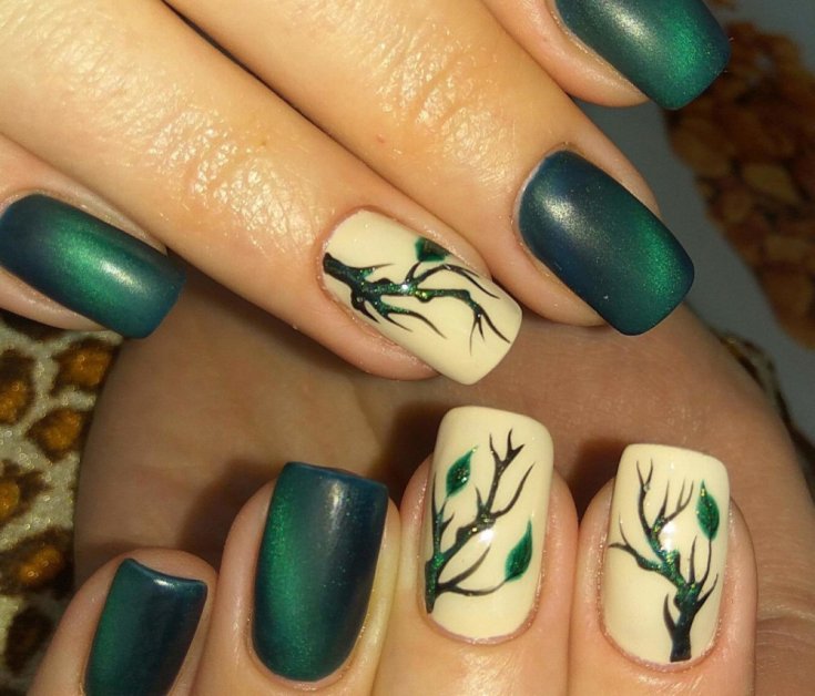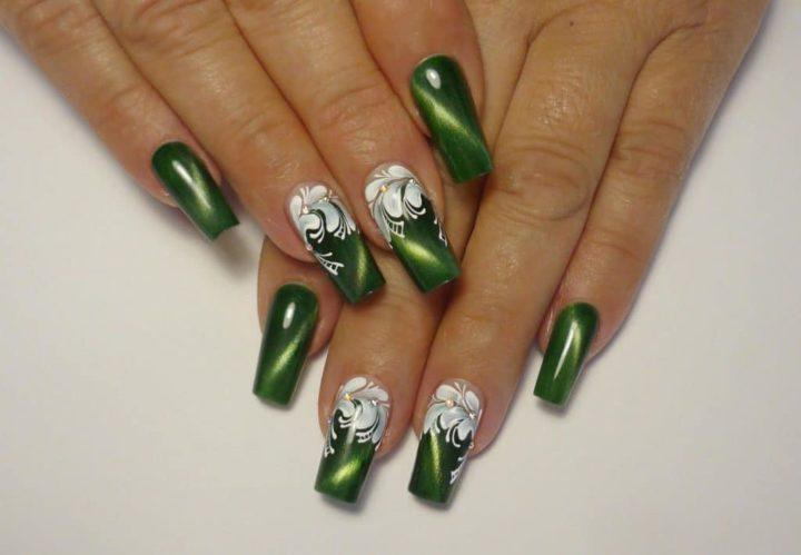 Фантазийные узоры позволят создать эффектный неповторимый нейл-арт с геометрическими, растительными, кружевными узорами. Пересекающиеся под разными углами линии на зеленом фоне подойдут для повседневного облика. Объемные вензеля и монограммы украсят ногти в любой ситуации. Весной девушки предпочитают цветочные композиции, навевающие прекрасное настроение.