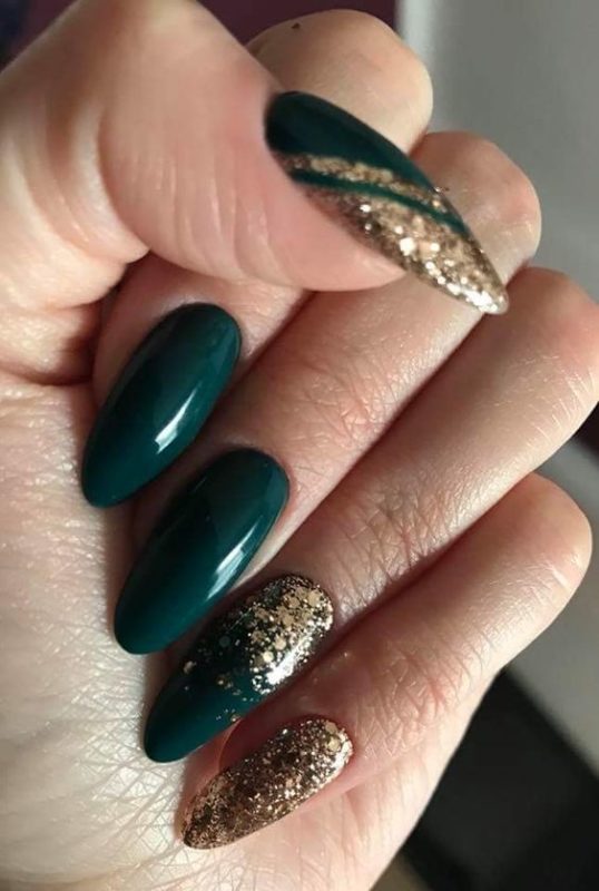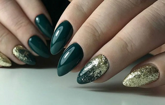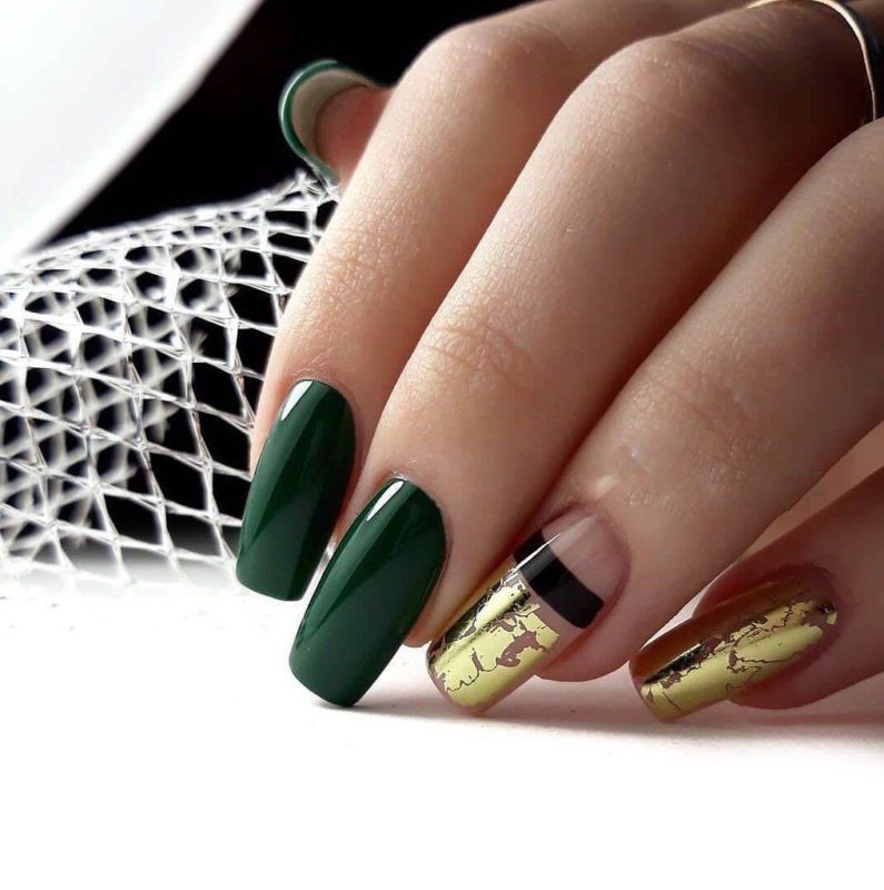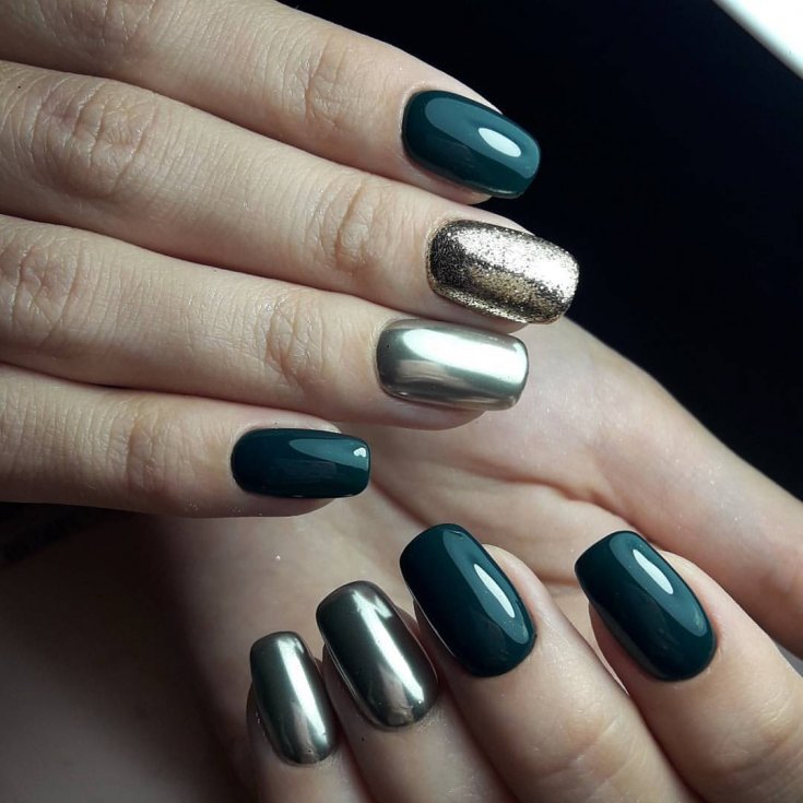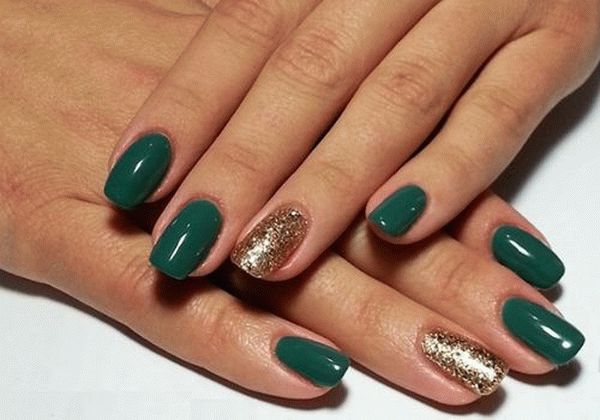 Изумрудный цвет восхитительно сочетается с золотым, который можно использовать как узор на зеленом фоне. С фольгой, глиттерами, цепочками зеленый маникюр с золотом напоминает ювелирное украшение и подходит для торжественного имиджа. В повседневной жизни лучше ограничиться серебристой отделкой или одним ногтем с позолотой.