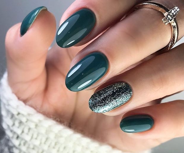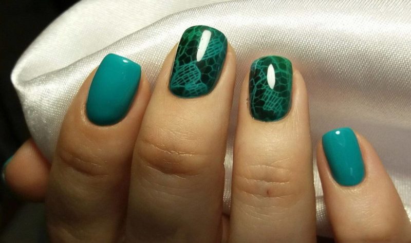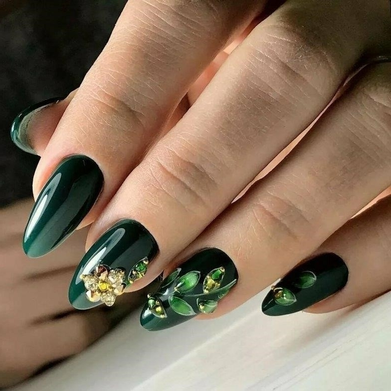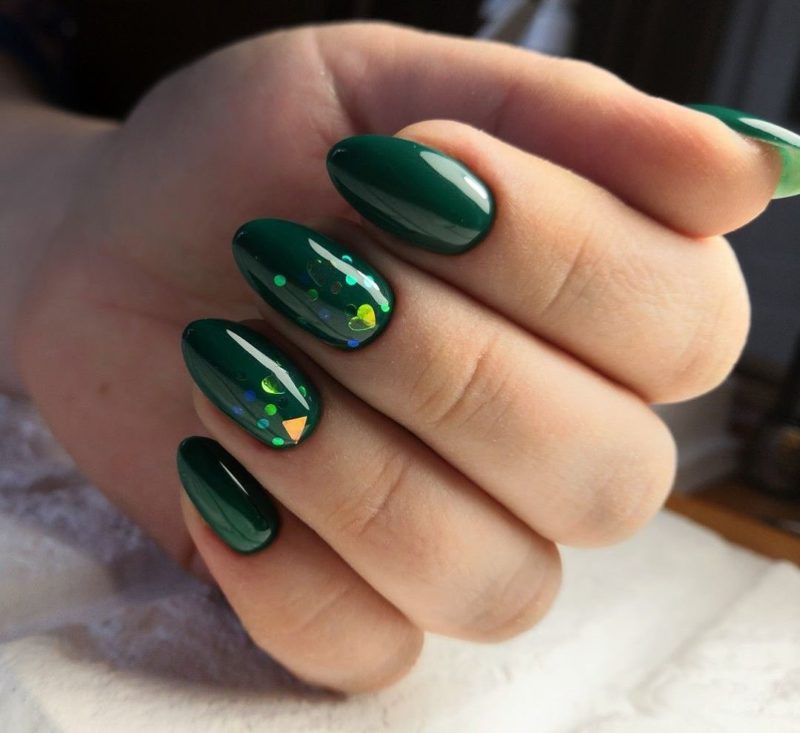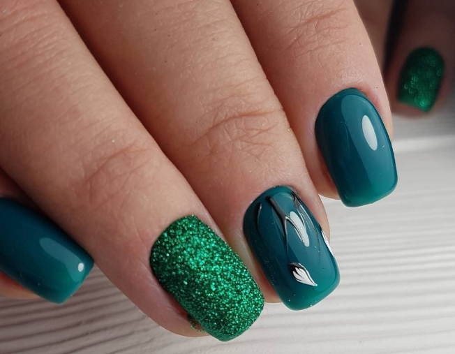 При нанесении насыщенного зеленого лака на ногти стоит учитывать специфику сочетания оттенков. Благородный спокойный цвет не терпит избыточного украшательства. Он не должен теряться под массивными узорами и обилием блесток.