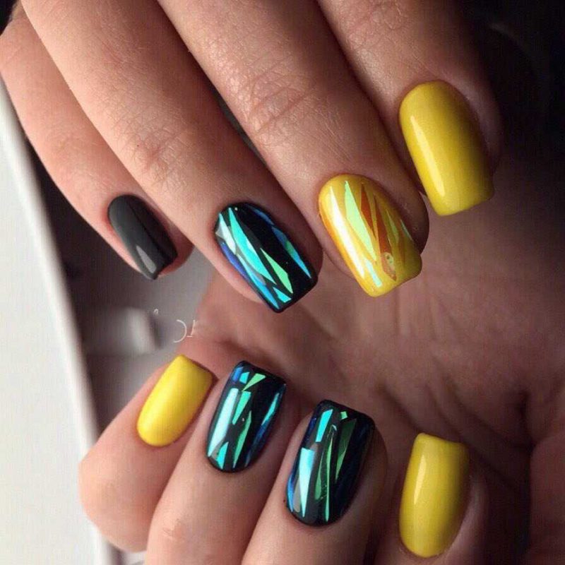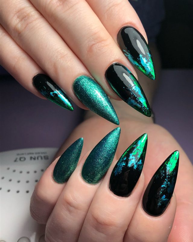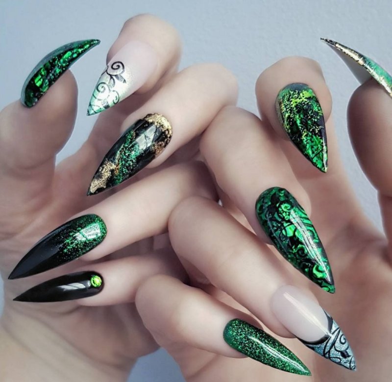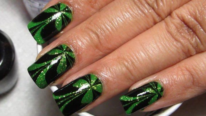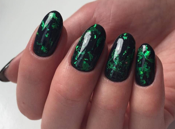 Необычная комбинация носит название готического стиля. Яркий нейл-арт допускает любой из этих оттенков в качестве основного покрытия. Черный цвет может стать эффектным акцентом на фоне зеленого в оформлении классического маникюра, омбре или геометрического рисунка.