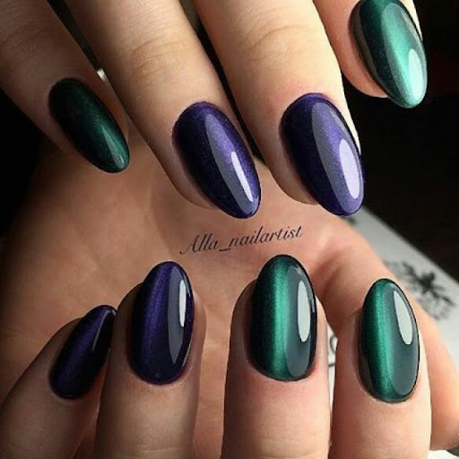 В последние годы у современных модниц получил распространение дизайн ногтей в стилистике камней. В весьма требовательном к колориту нейл-арте «кошачий глаз» используют магнитный гель-лак насыщенного изумрудного цвета, на фоне которого блистают мелкие элементы, собранные вокруг основного магнита.