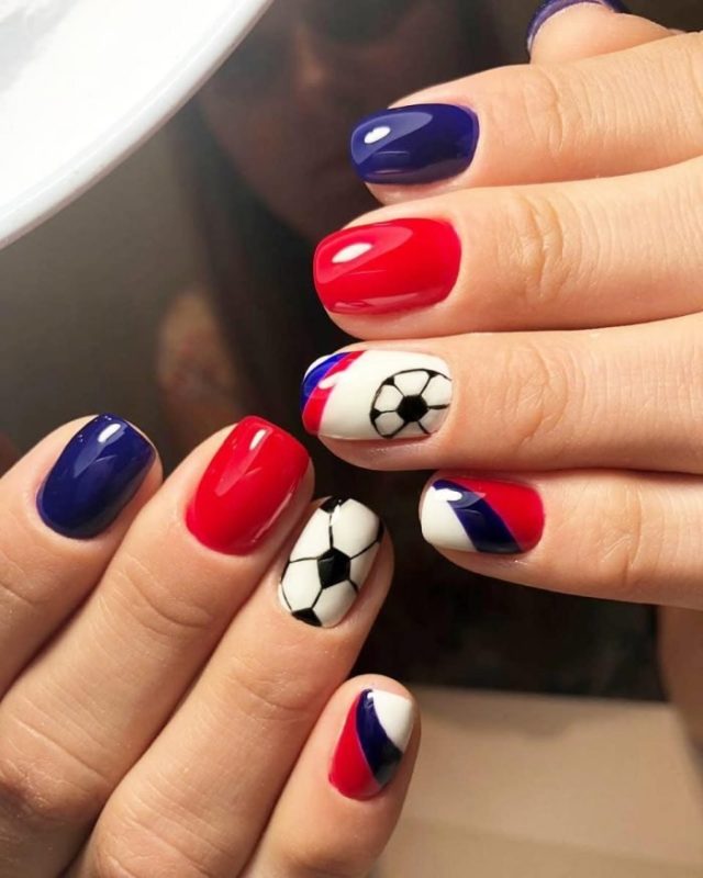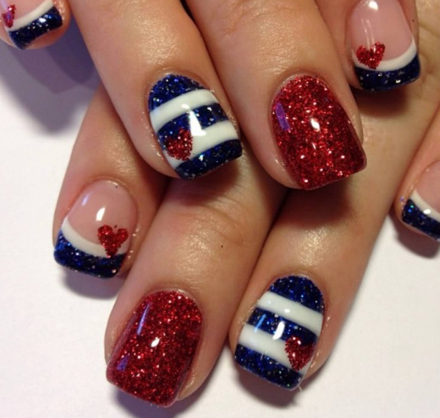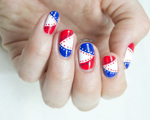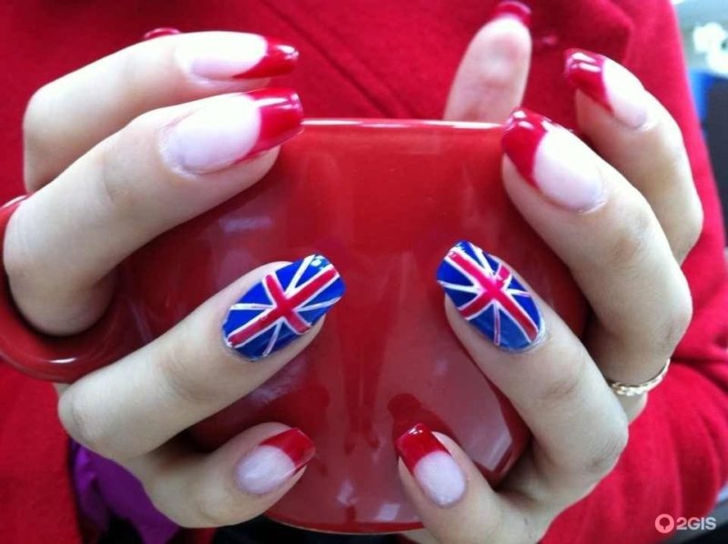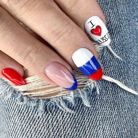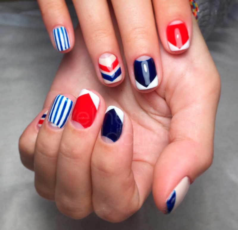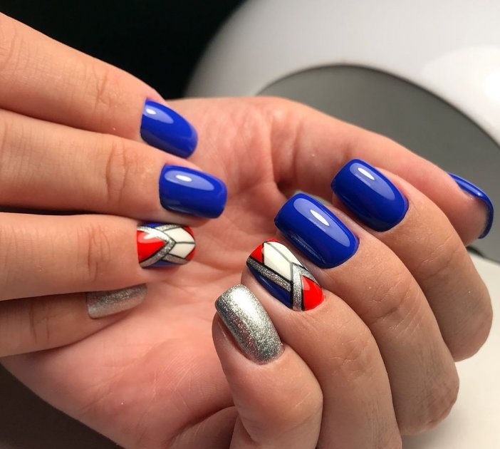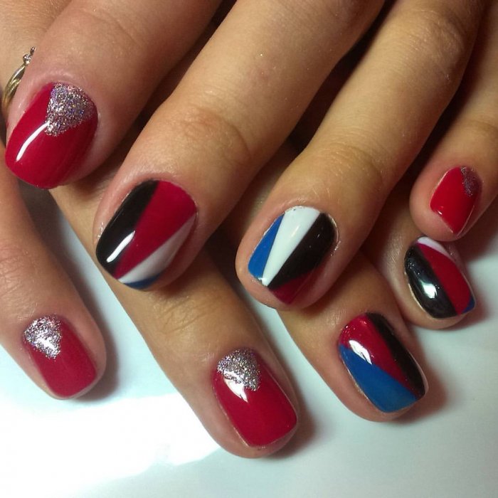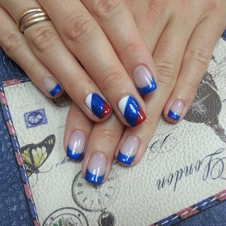 Для обладательниц коротких ногтей можно выбрать красно-синий глиттер. Отличным выбором станет и роспись в красно-синие треугольники. Уместно будут смотреться и рисунки в виде флагов.