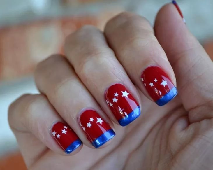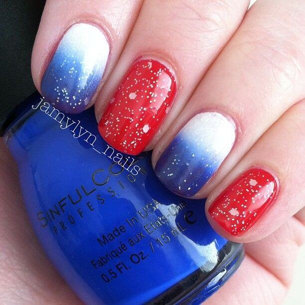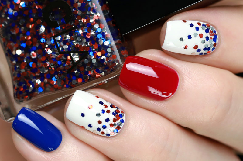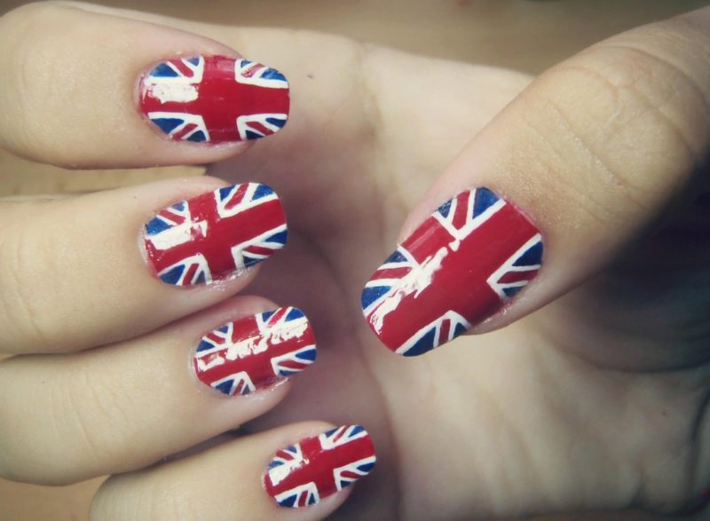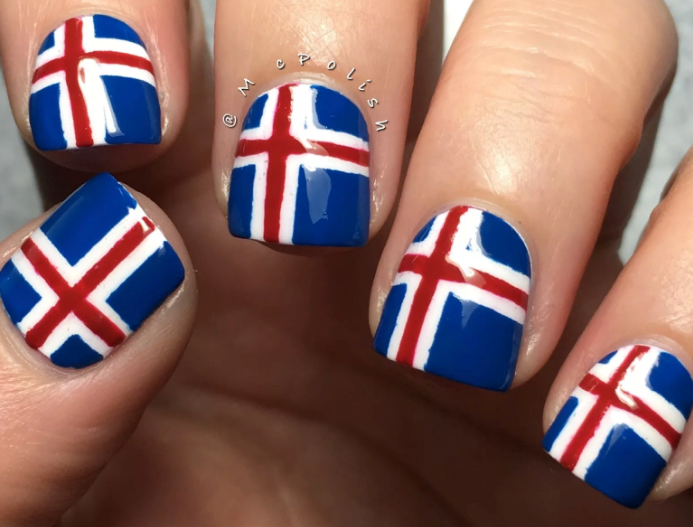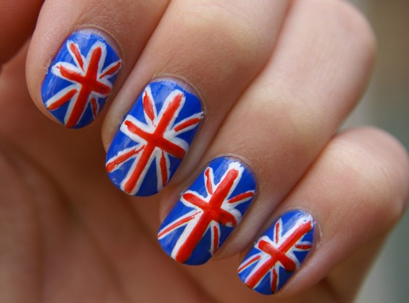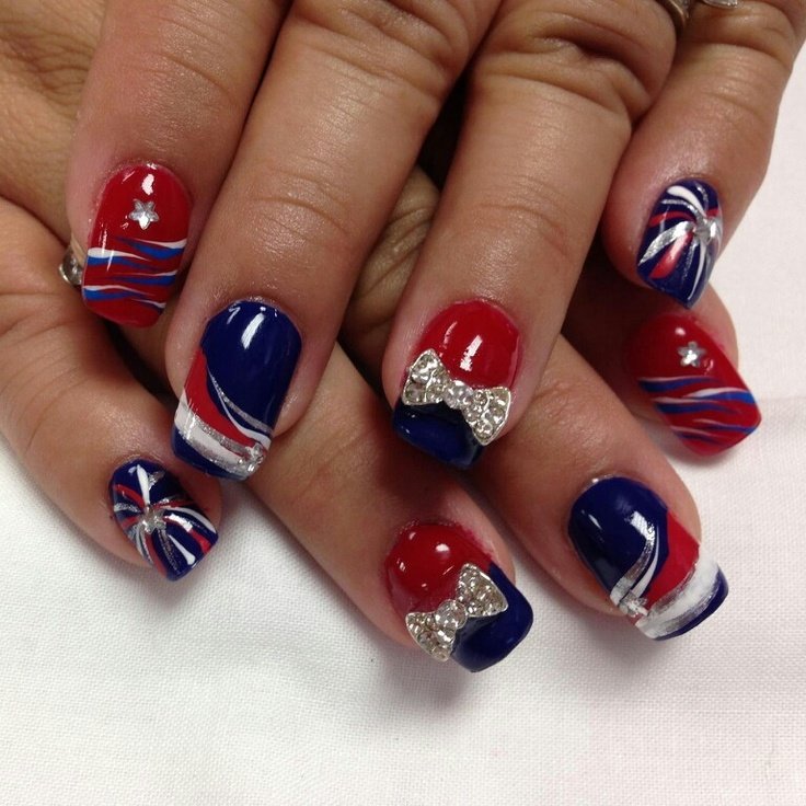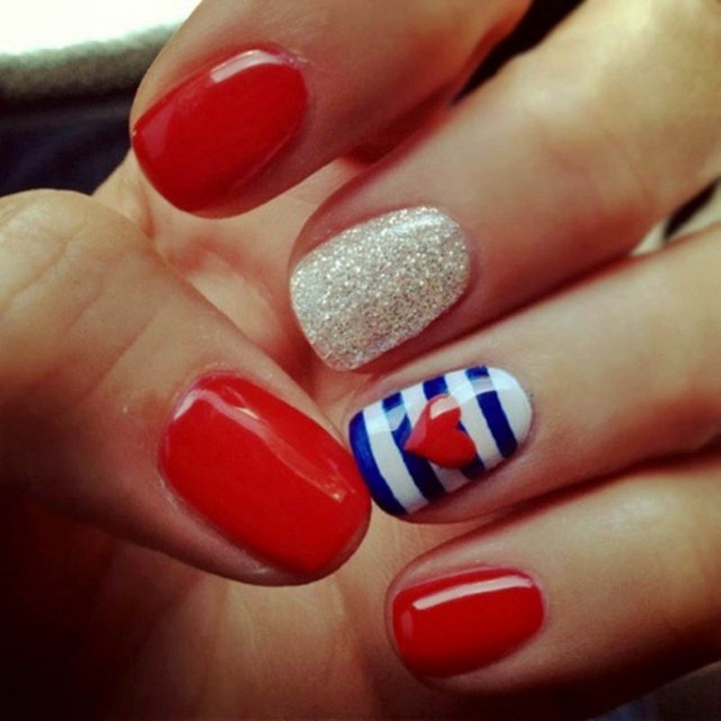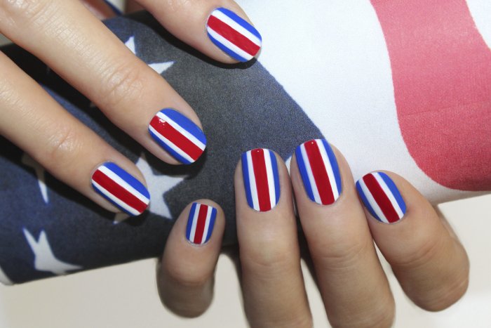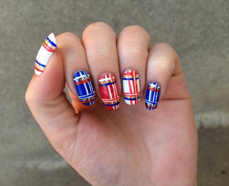 Для обладательниц коротких ногтей можно выбрать красно-синий глиттер. Отличным выбором станет и роспись в красно-синие треугольники. Уместно будут смотреться и рисунки в виде флагов.