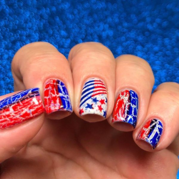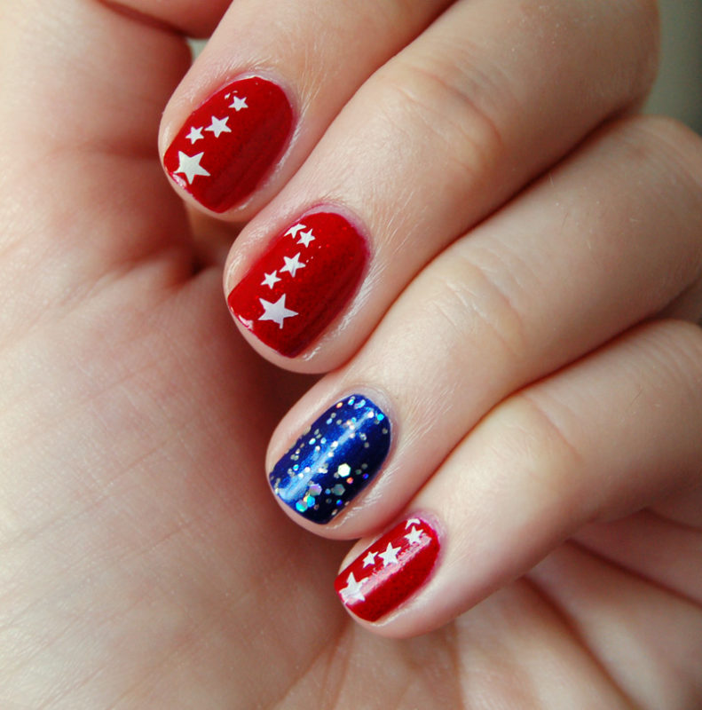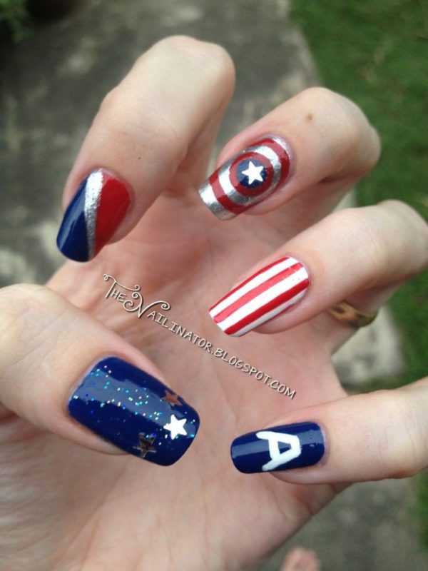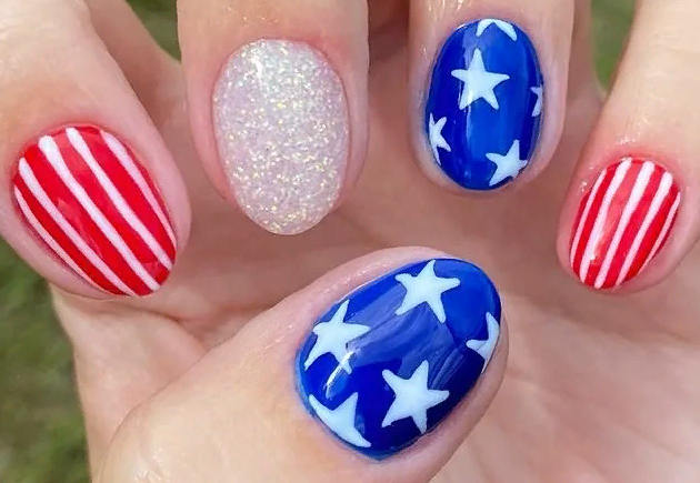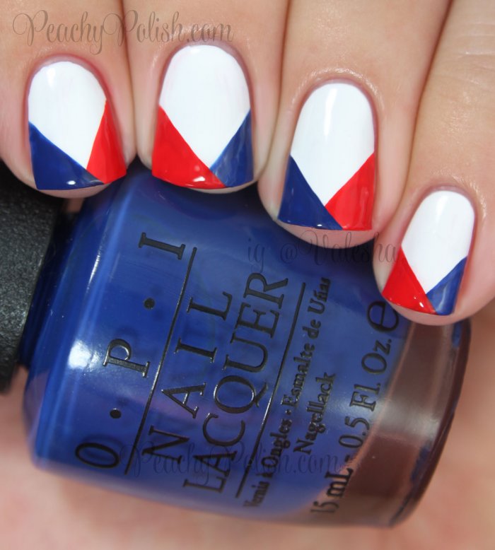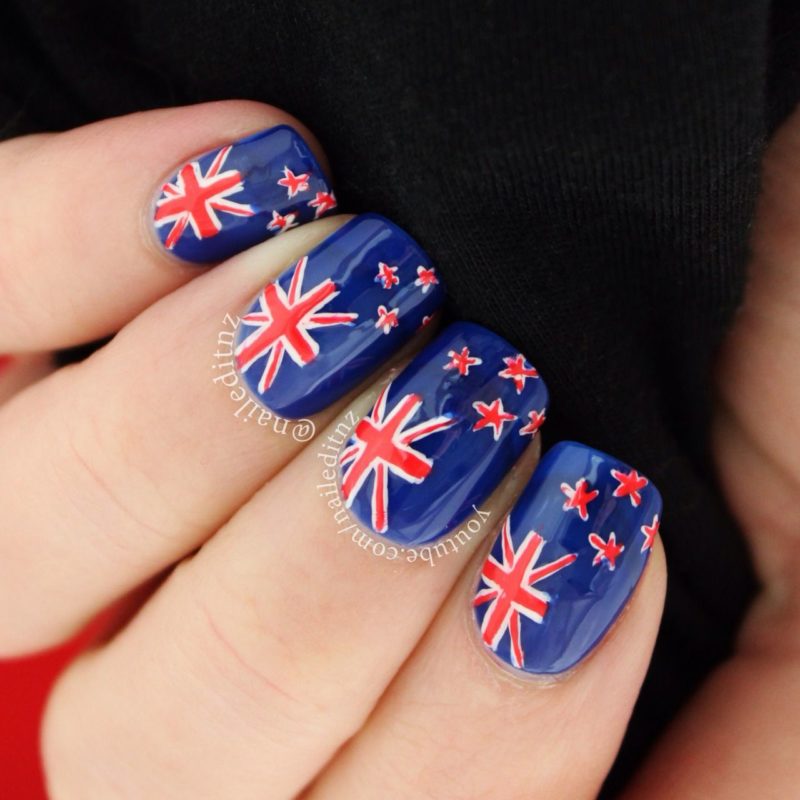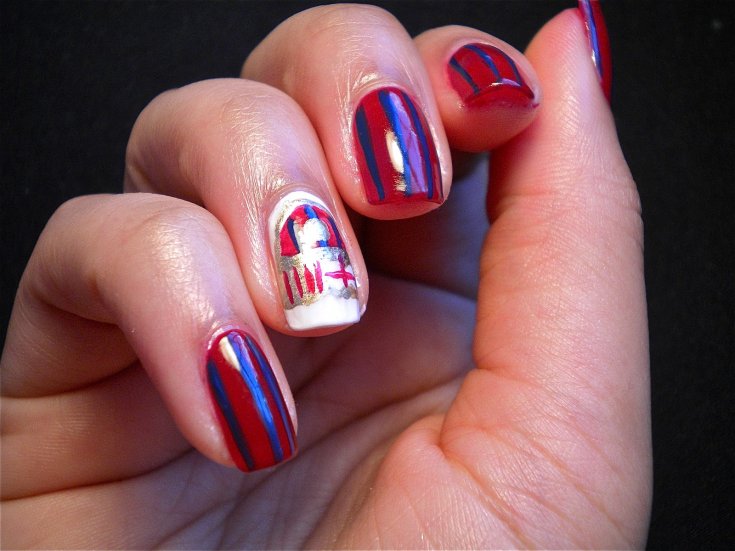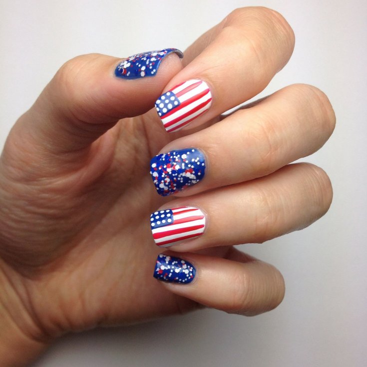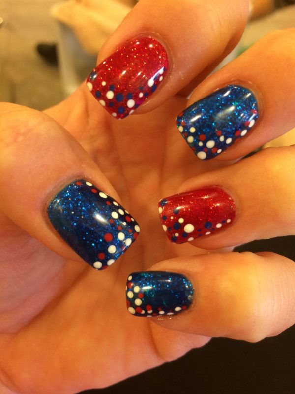 Для обладательниц коротких ногтей можно выбрать красно-синий глиттер. Отличным выбором станет и роспись в красно-синие треугольники. Уместно будут смотреться и рисунки в виде флагов.