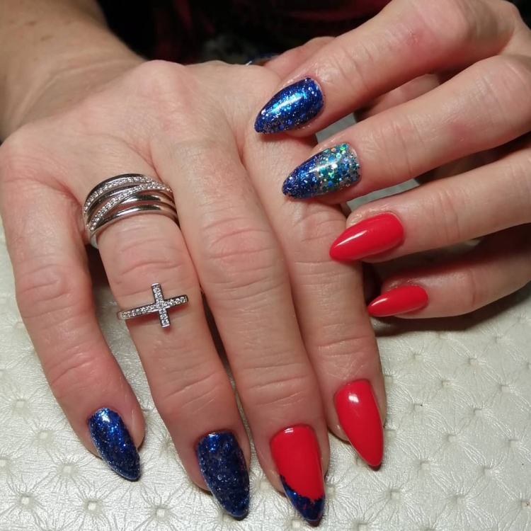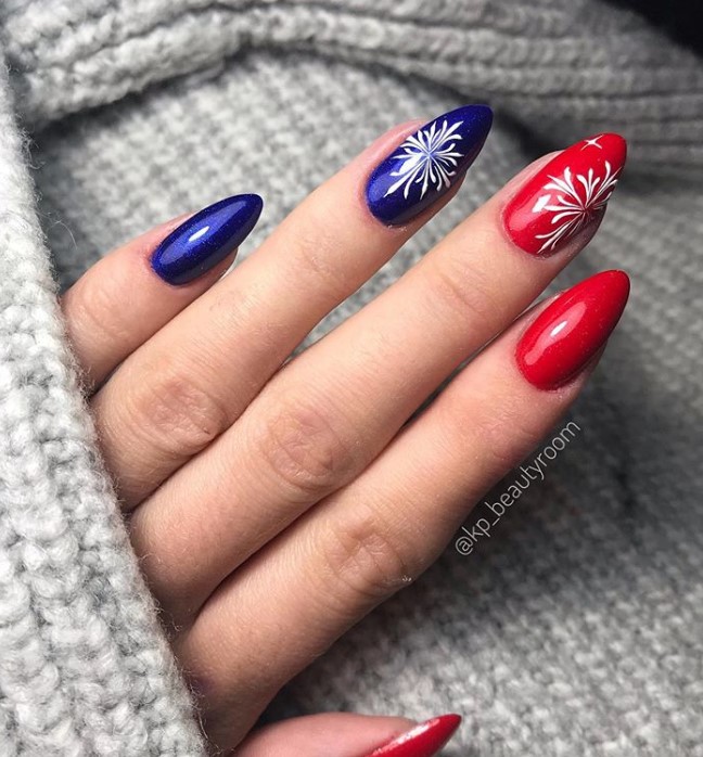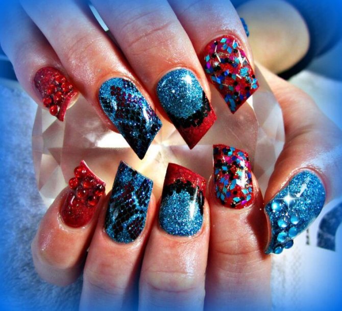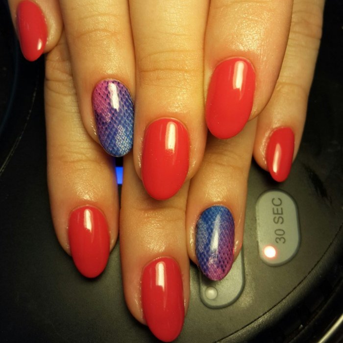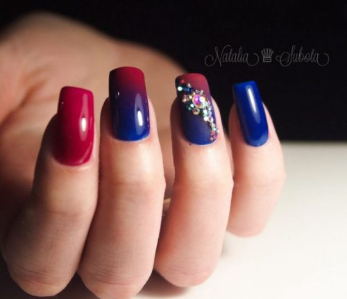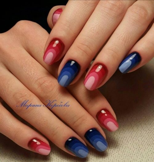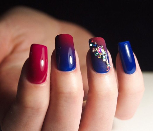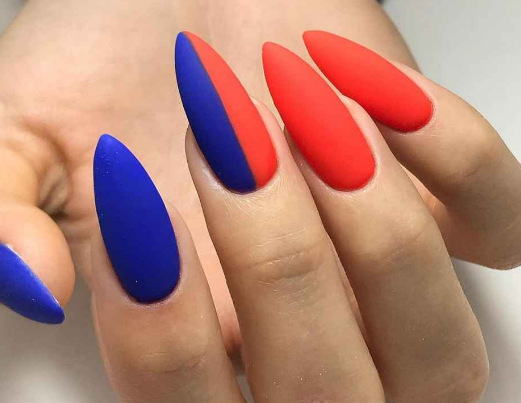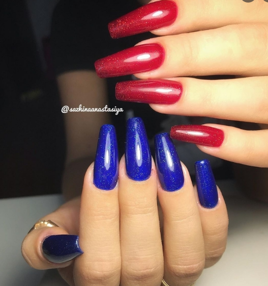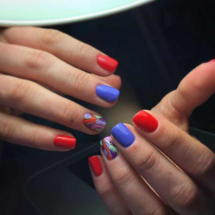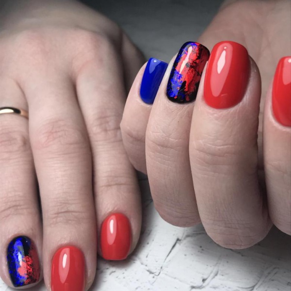 Синий с красным маникюр подходит для разной длины ногтей. В каждом случае предусмотрены определенные типы дизайна. Они интересны и точно понравятся вам.