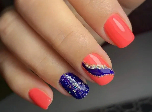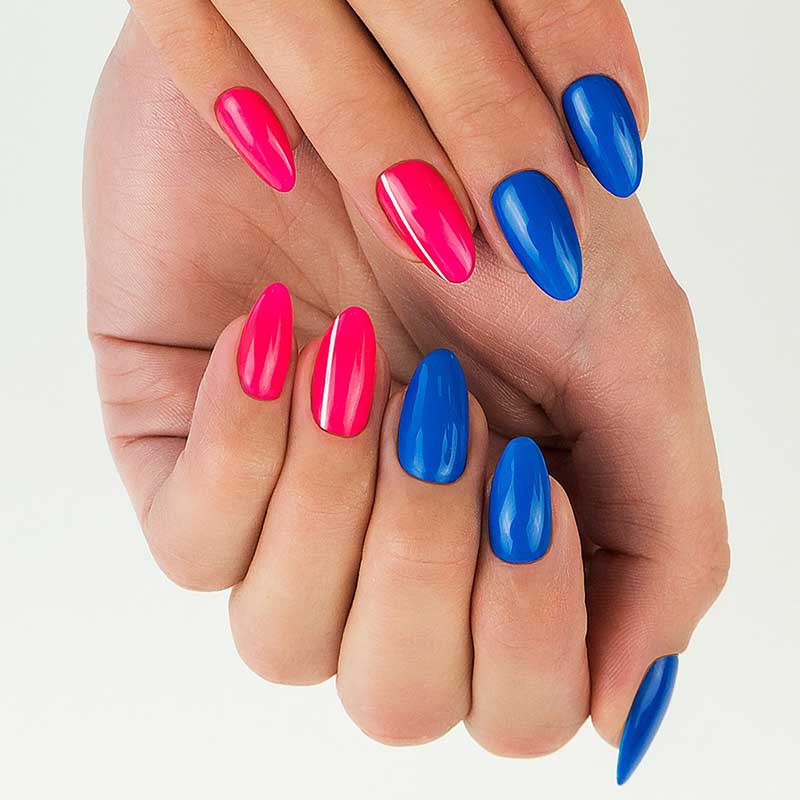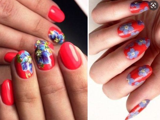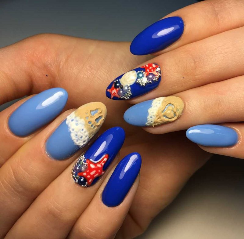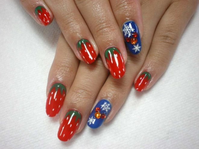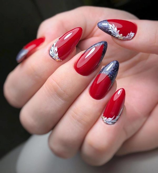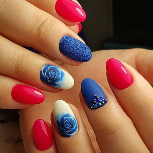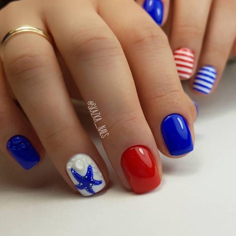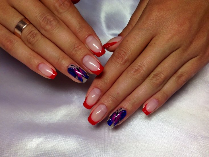 Синий с красным маникюр подходит для разной длины ногтей. В каждом случае предусмотрены определенные типы дизайна. Они интересны и точно понравятся вам.