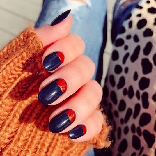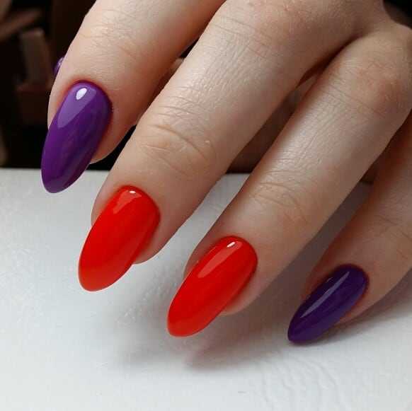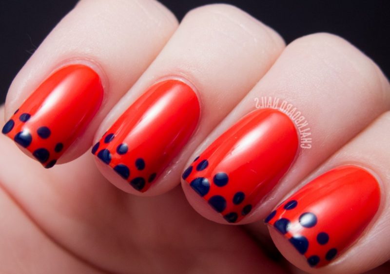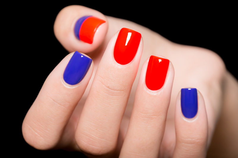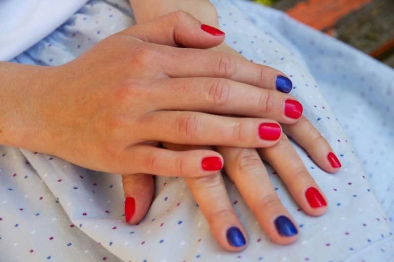 Рекомендуется покрывать ногти красным лаком, а область лунки выделять синим. Если вы скромница, цвета следует поменять. Интересно будет смотреться и вариант, в котором пальцы окрашены в разные цвета.