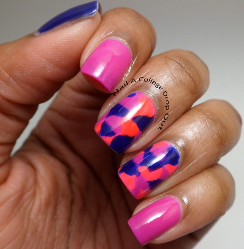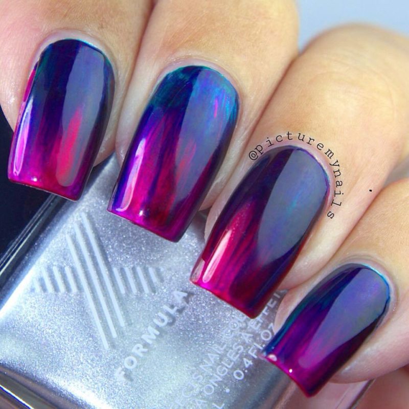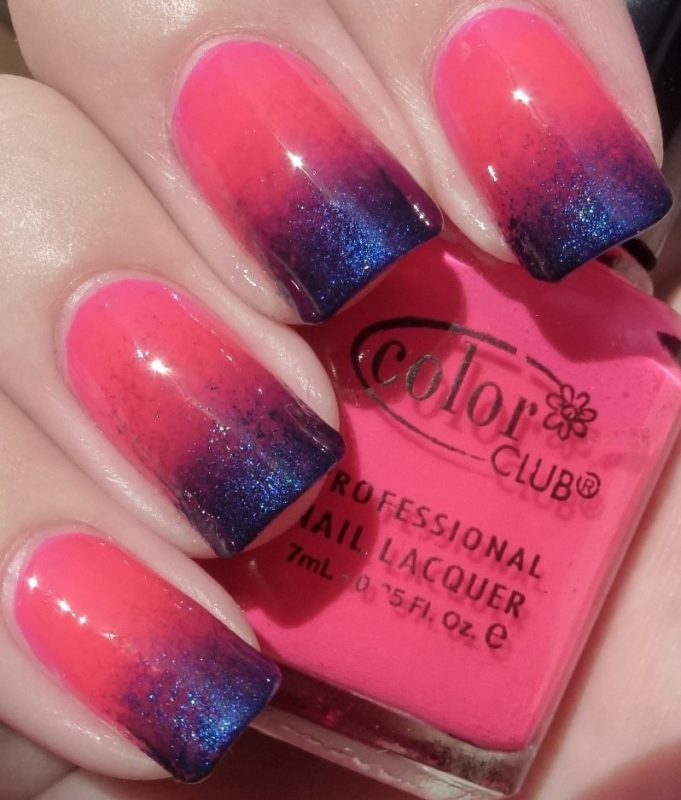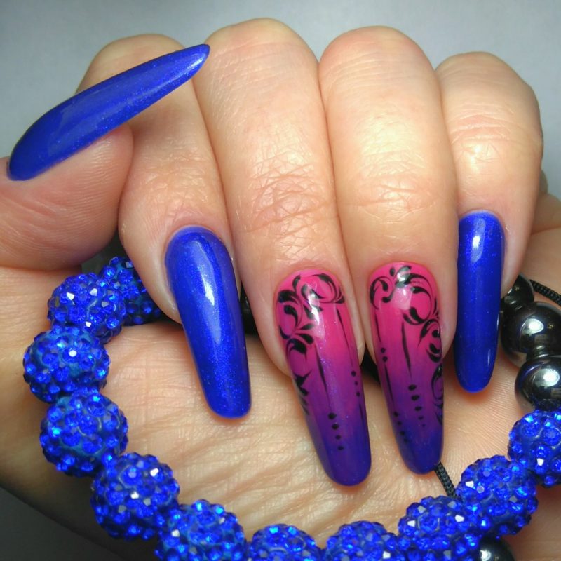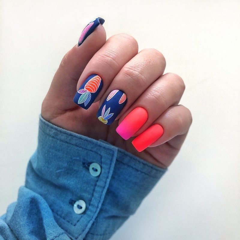 Такой маникюр выглядит необычно. Если вы желаете немного сгладить эффект, следует использовать градиент. Также можно выбрать пастельные оттенки цветов.