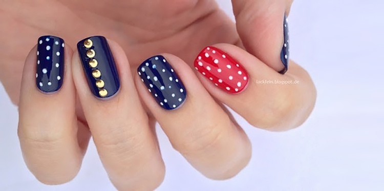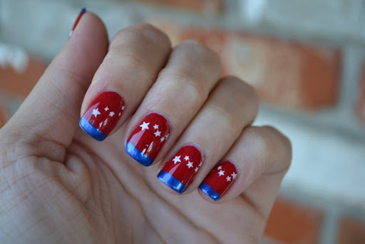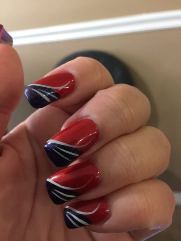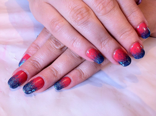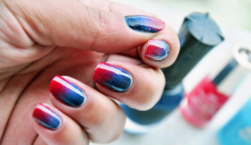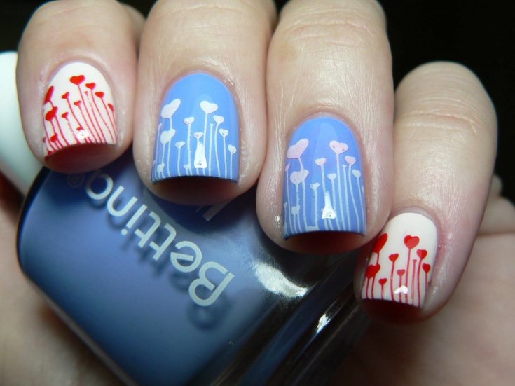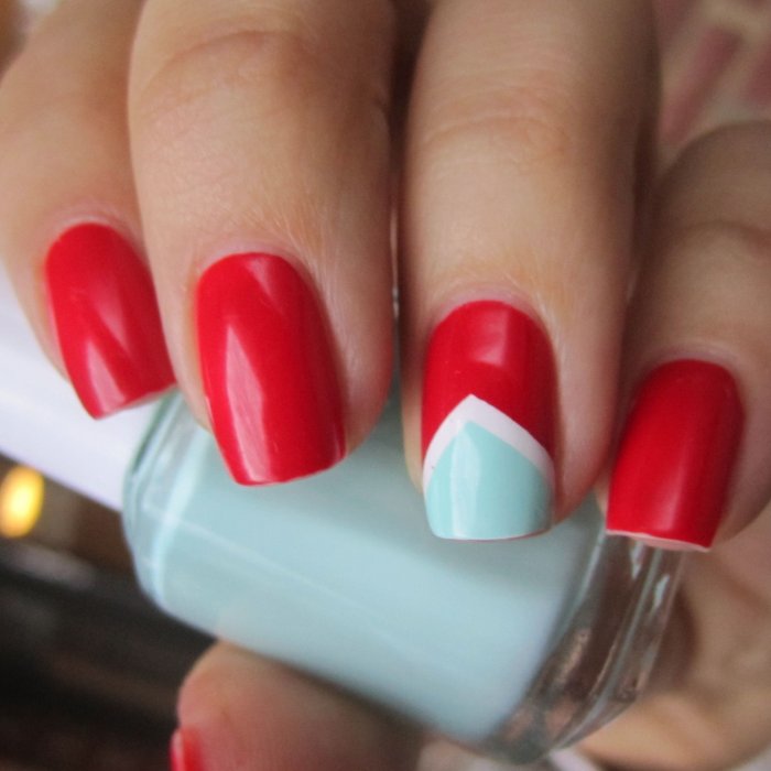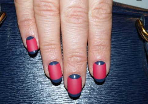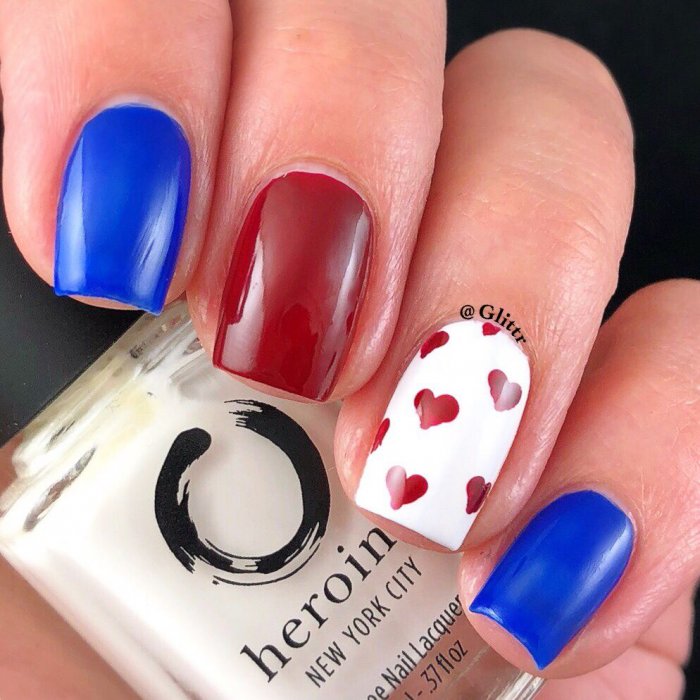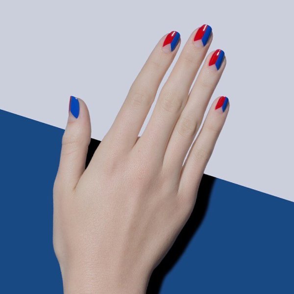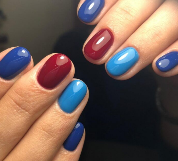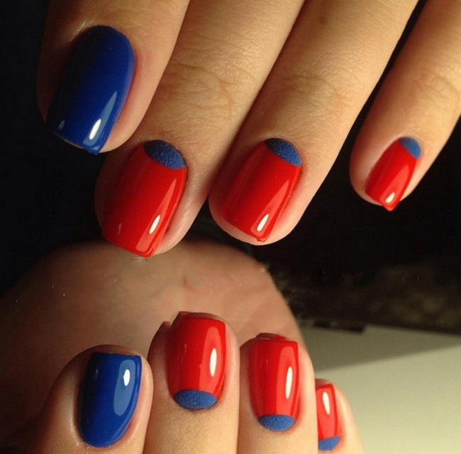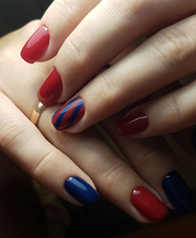 В маникюре классическим считается сочетание красного и синего таким образом: