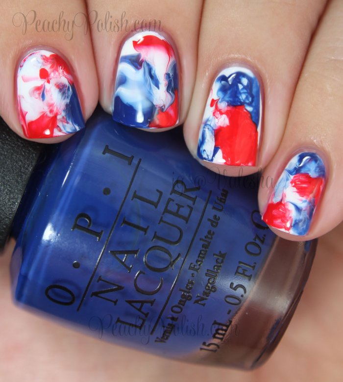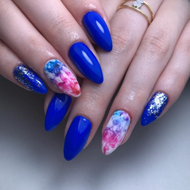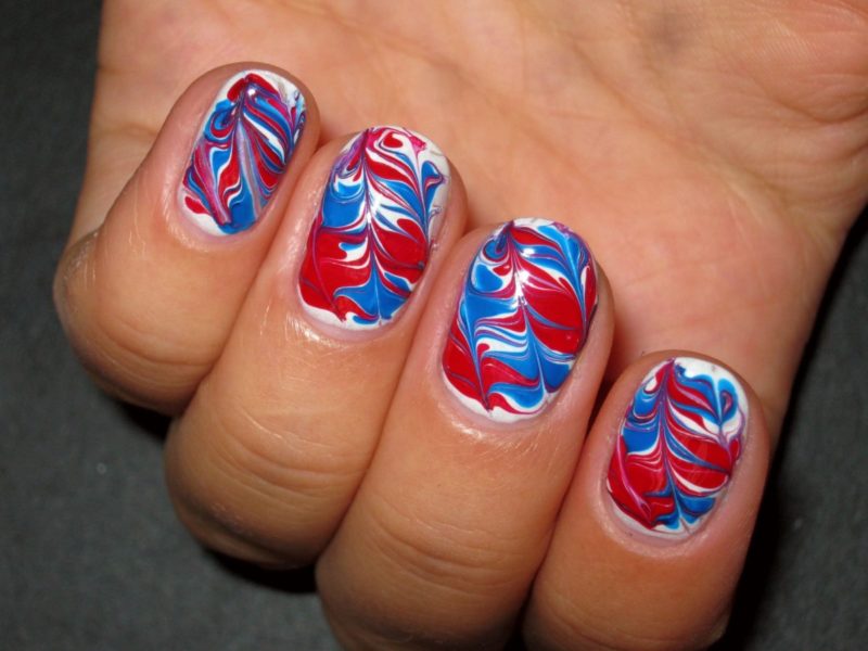 Тенденция на естественность не теряет свои позиции в текущем году. Мраморный дизайн смотрится роскошно и таинственно. Чтобы создать его, можно использовать и красно-синий маникюр, фото которого вы видите, выполняя реалистичные узоры.