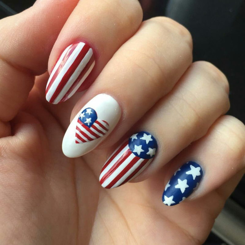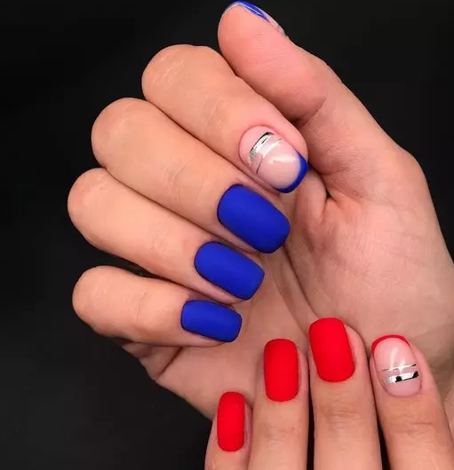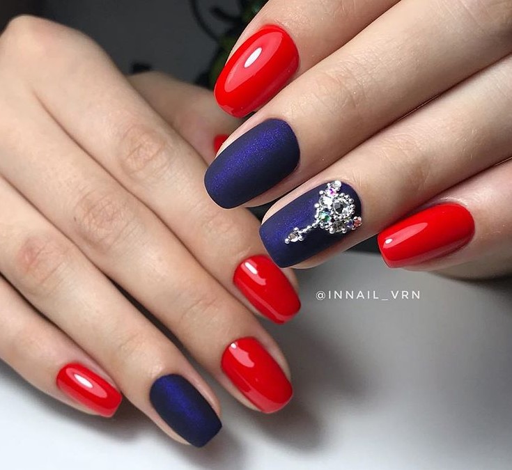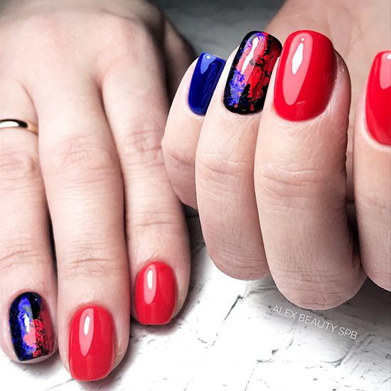 Эффектно выглядит маникюр с красно-сине-черным или белым оттенками. Топ при этом берется матовый. Выделить так можно как все ногти, так и несколько.