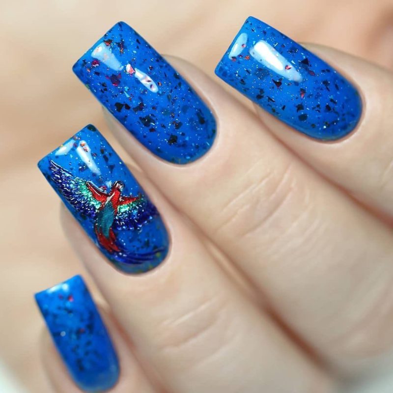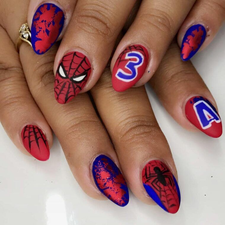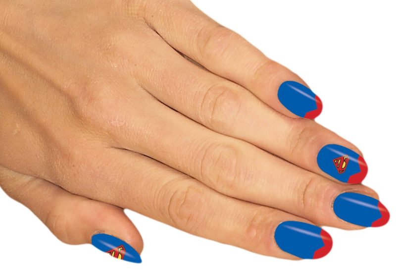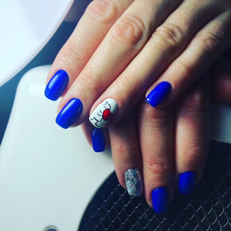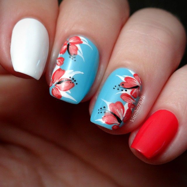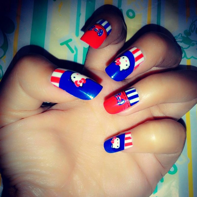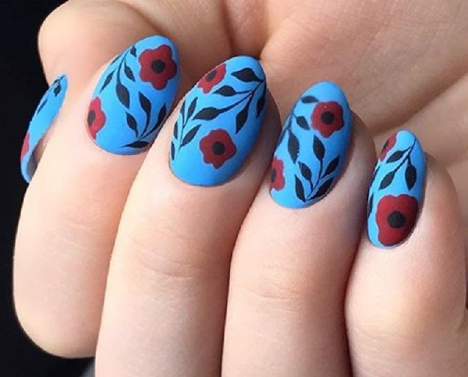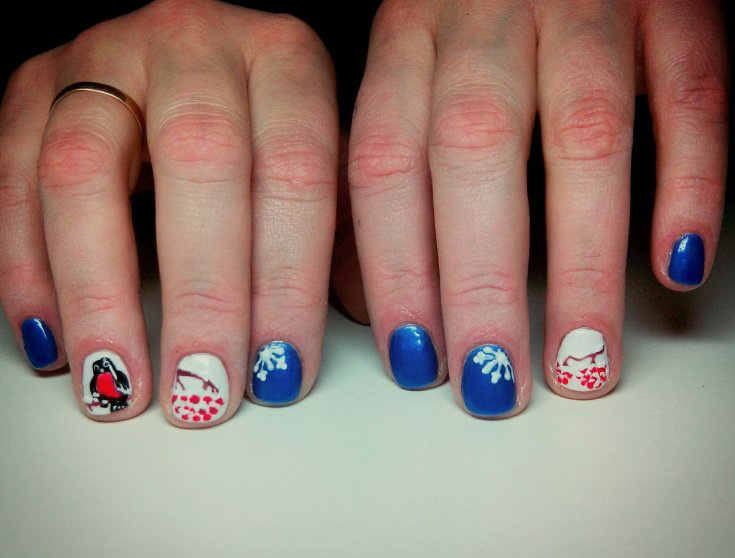 Сочетание синего и красного само по себе смотрится интересно. Декоративные элементы в этом случае можно выбрать любые. Тематические рисунки должны отражать настроение своей обладательницы.