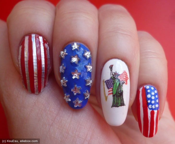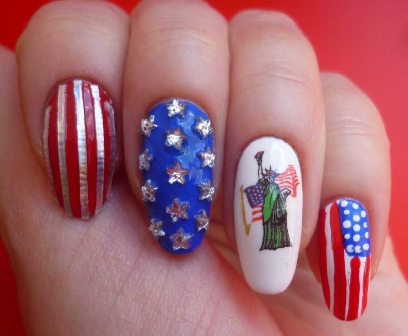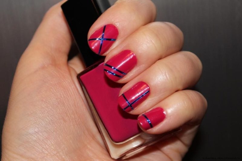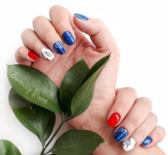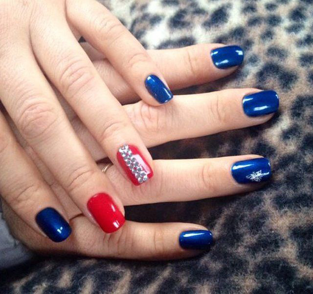 Важно! Сильно перегружать дизайном пластины не следует. Можно просто покрыть их однотонными цветами — один ноготь синий, следующий — красный. Или накрасить большинство ногтевых пластин красным цветом, а акценты сделать синим. Такой вариант подойдет для клубных вечеринок.
