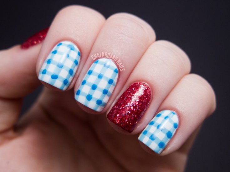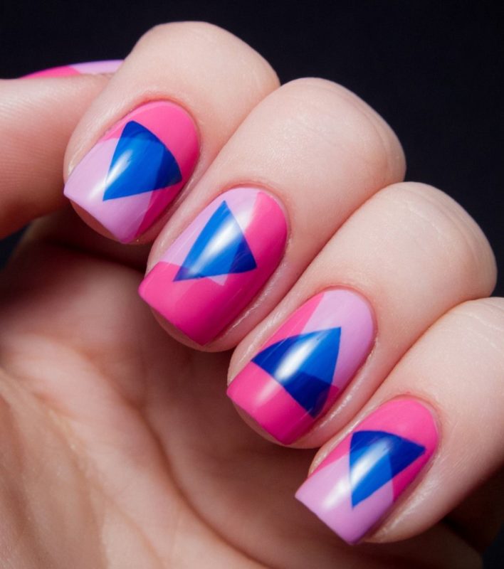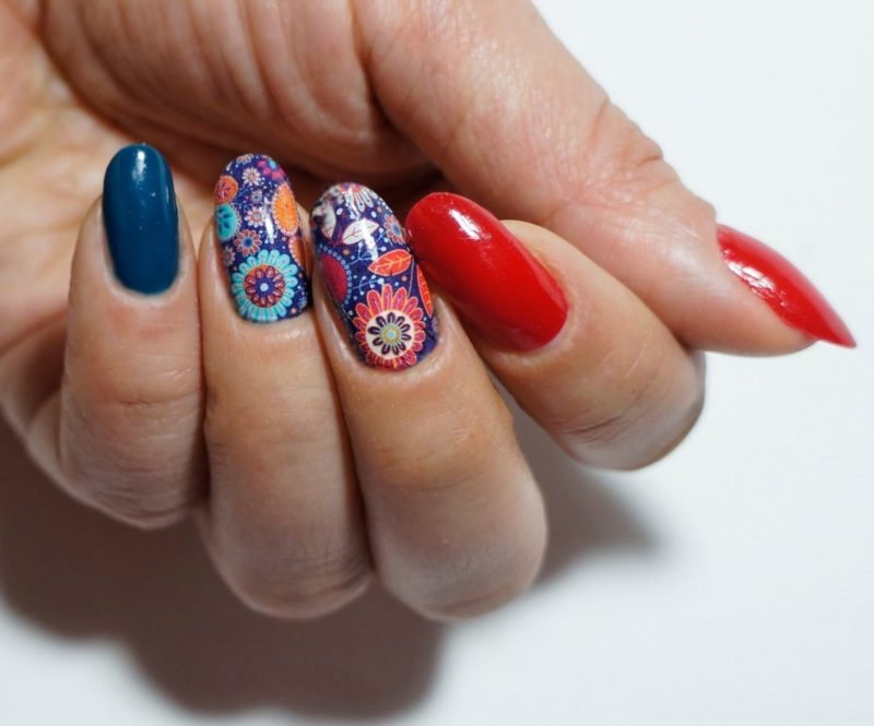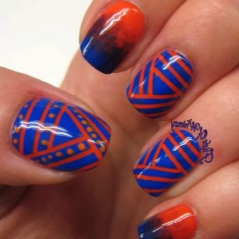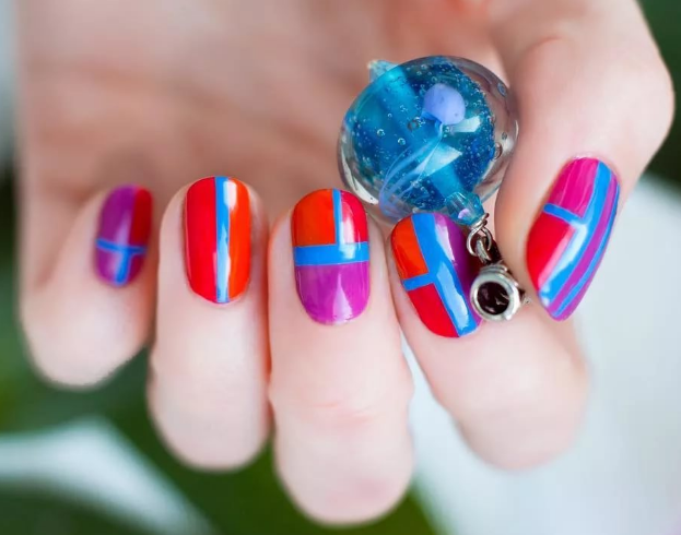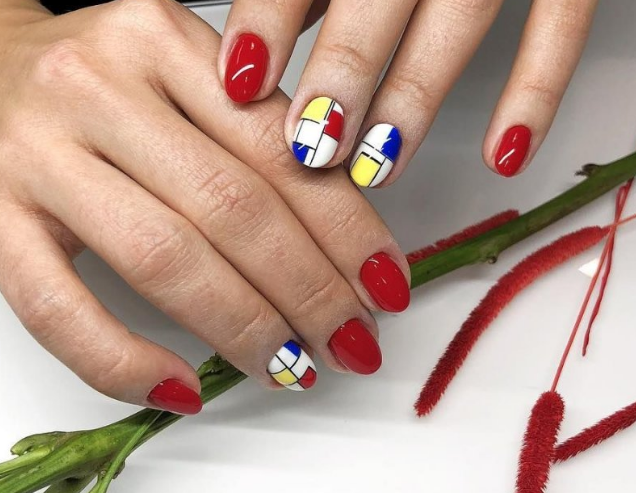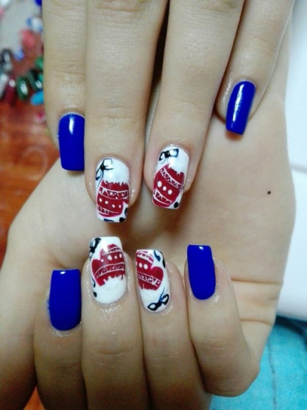 Яркие оттенки идеально подчеркивают красно-синие рисунки в виде орнаментов. Они могут быть совершенно разными: от ромбов до строгих сочетаний полосок и квадратов. Лучше всего наносить их при помощи стемпинга или наклеек. Тогда контуры получатся ровными.