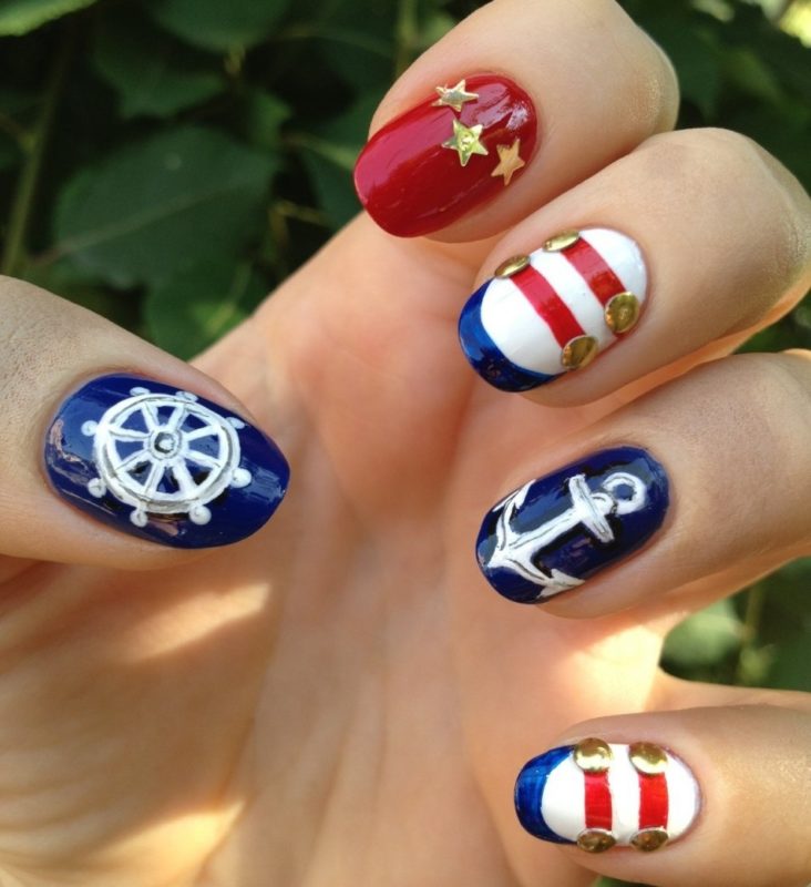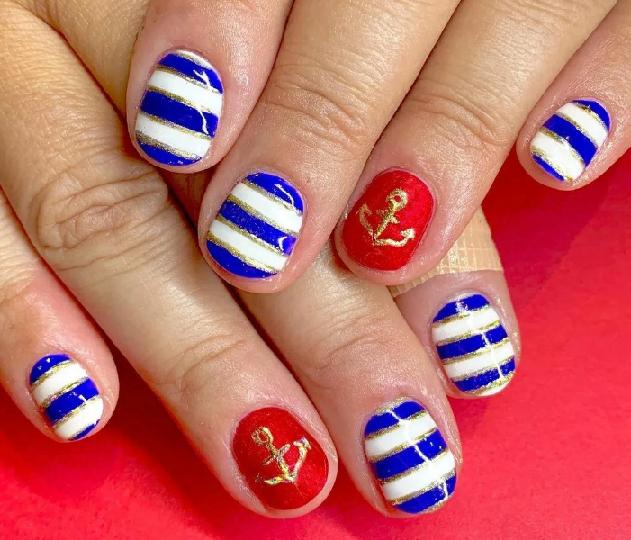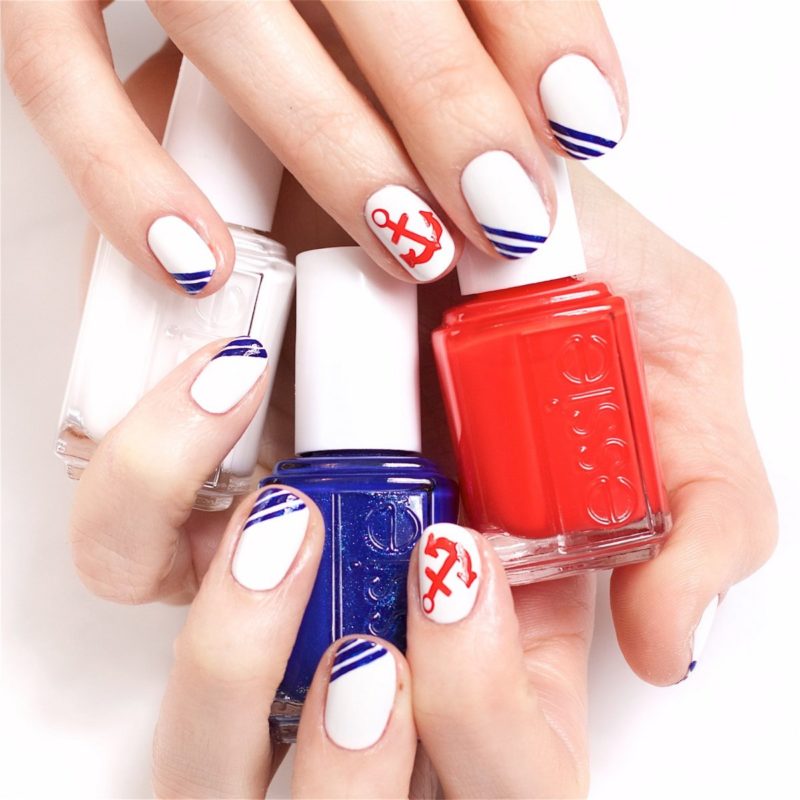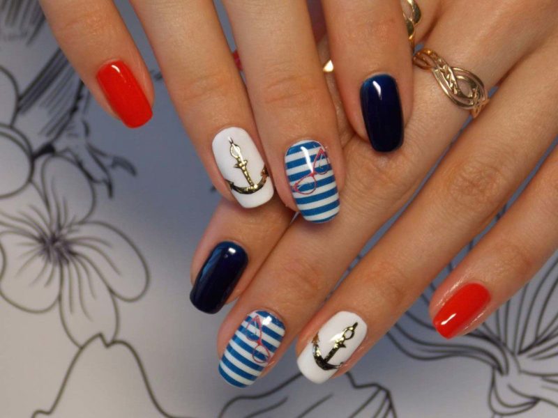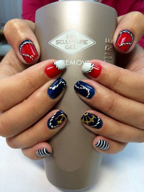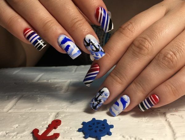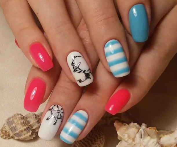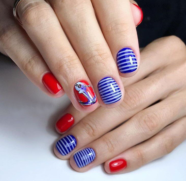 Летом стоит отдать предпочтение морскому стилю. Самый простой вариант — сочетание полосок разного оттенка. Дополнить дизайн можно и рисунками в виде ракушек, якоря, морских обитателей.
