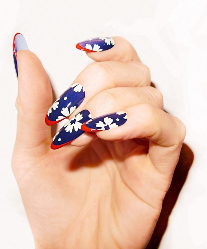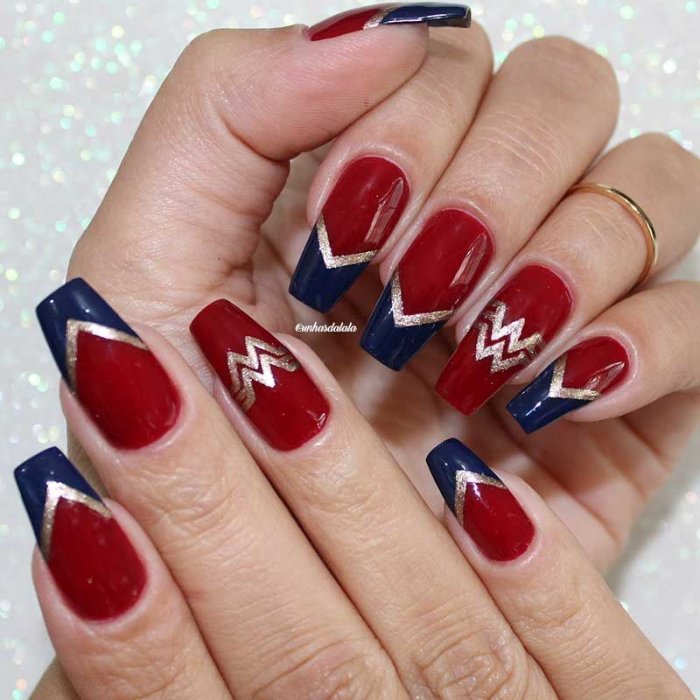 На длинных ногтях красно-синий маникюр выглядит торжественно.