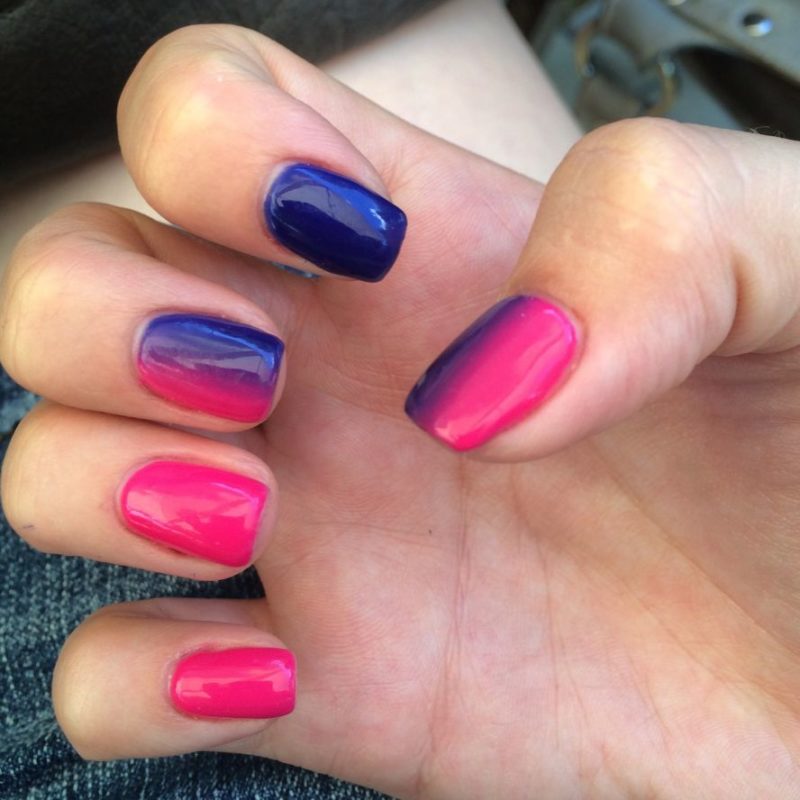 Такая техника позволяет тонам гармонировать друг с другом. Переход оттенка может быть как вертикальным, так и горизонтальным. При желании можно использовать и третий колер, например, белый. Результат получится максимально изысканным.