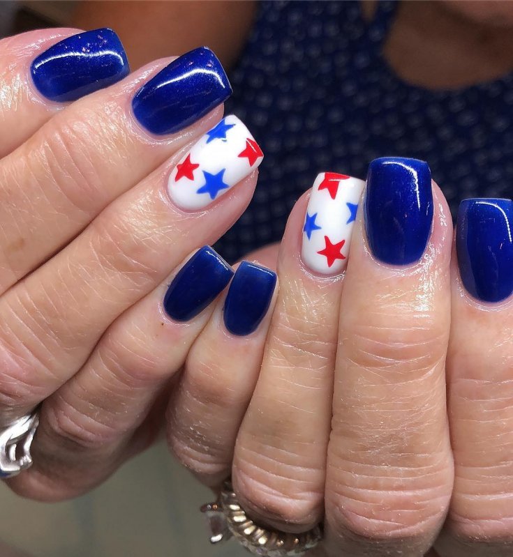 Белоснежные участки всегда выглядят привлекательно. Даже самое простое сочетание маникюр синий красный белый смотрится выигрышно. В таком сочетании можно сделать дизайн на морскую, патриотическую тематику и т.п.