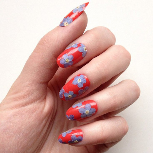 Форму и размер цветов можно выбрать любые. Если ногти короткие, перегружать их крупными рисунками не следует. На длинных ногтях можно рисовать все что угодно, даже расплывчатые бутоны.