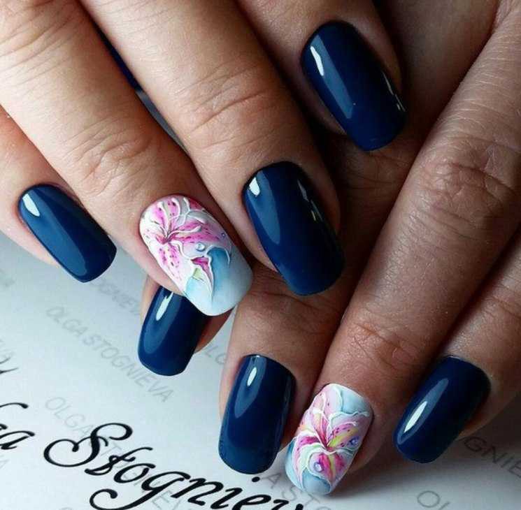 Очаровательно смотрится маникюр на темно-синем фоне в красный цветок. Он подчеркивает женственность своей обладательницы. Преимущественно такой нейл-арт используется для торжественных мероприятий.