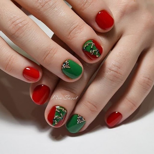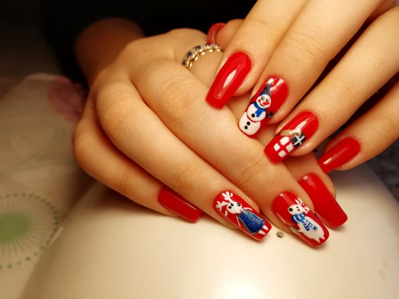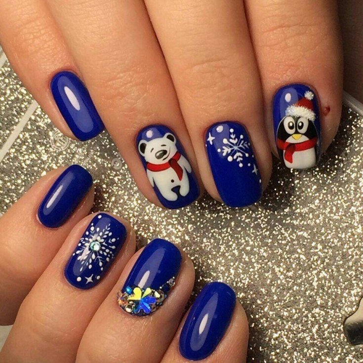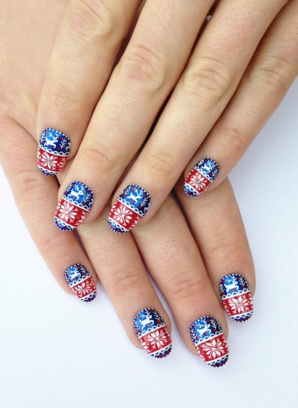 Если на праздник хочется чего-то особенного, можно выбрать оригинальный дизайн с рисунками в виде елочек, Деда Мороза, подарков. Очаровательно будет выглядеть вариант сочетания красных, синих и белых полос. Их можно расположить диагонально, перемежая с узорами.