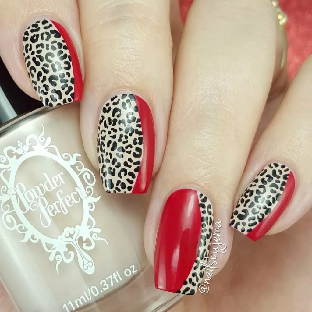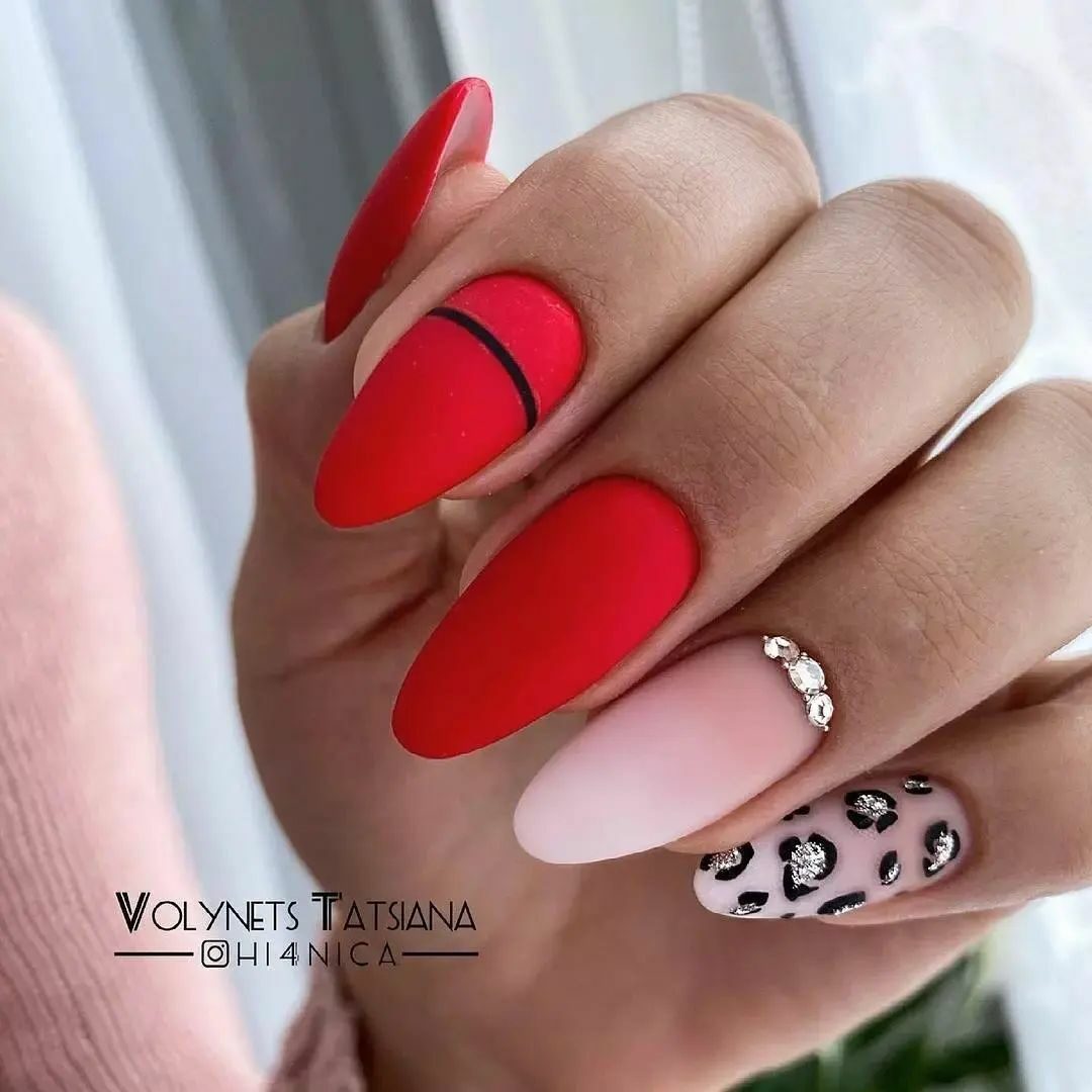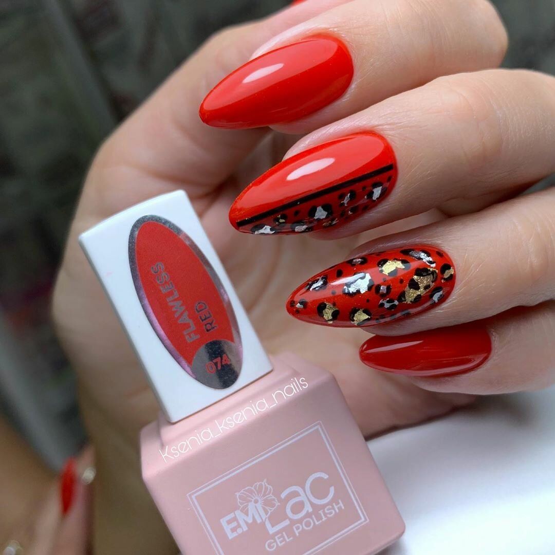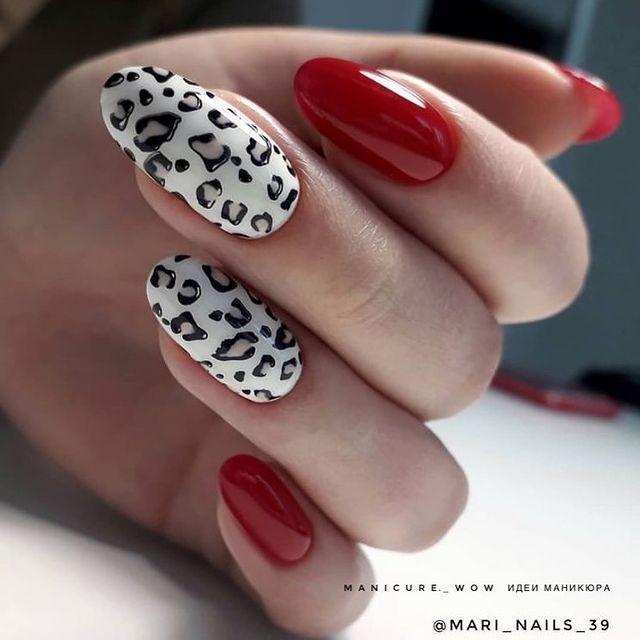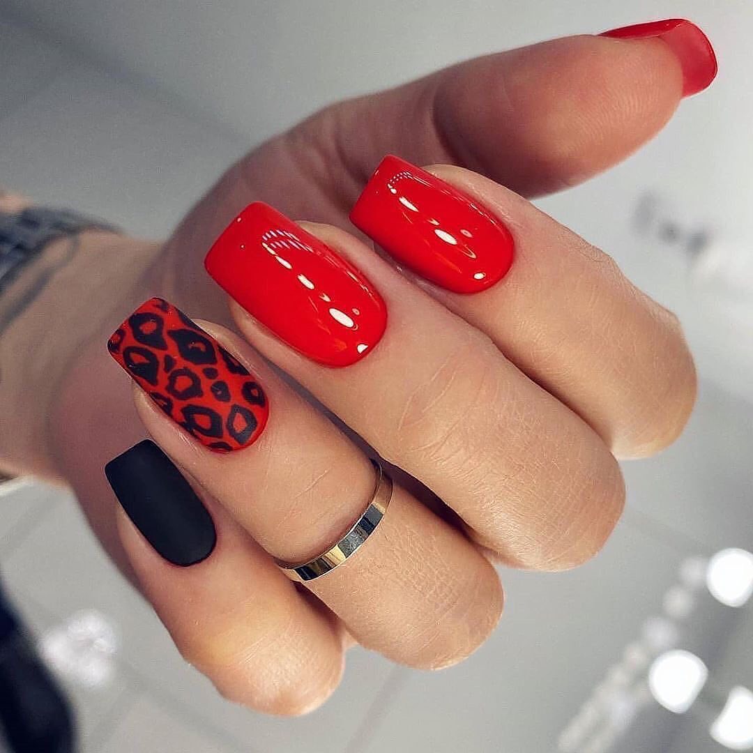 Сочетание животного принта и красного маникюра вам кажется чрезмерным? Вовсе нет, если к делу подойти с умом. Особенно актуальным в этом сезоне считается леопардовый принт. Но не стоит окрашивать все ноготки в яркую леопардовую расцветку. Выбирайте спокойные красные тона и дополняйте небольшими животными акцентами. Чтобы немного приглушить 2 активных приема в маникюре — красный цвет и леопардовый принт — используйте матовую текстуру.