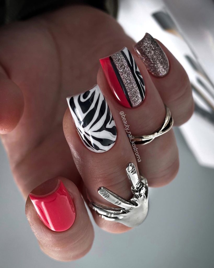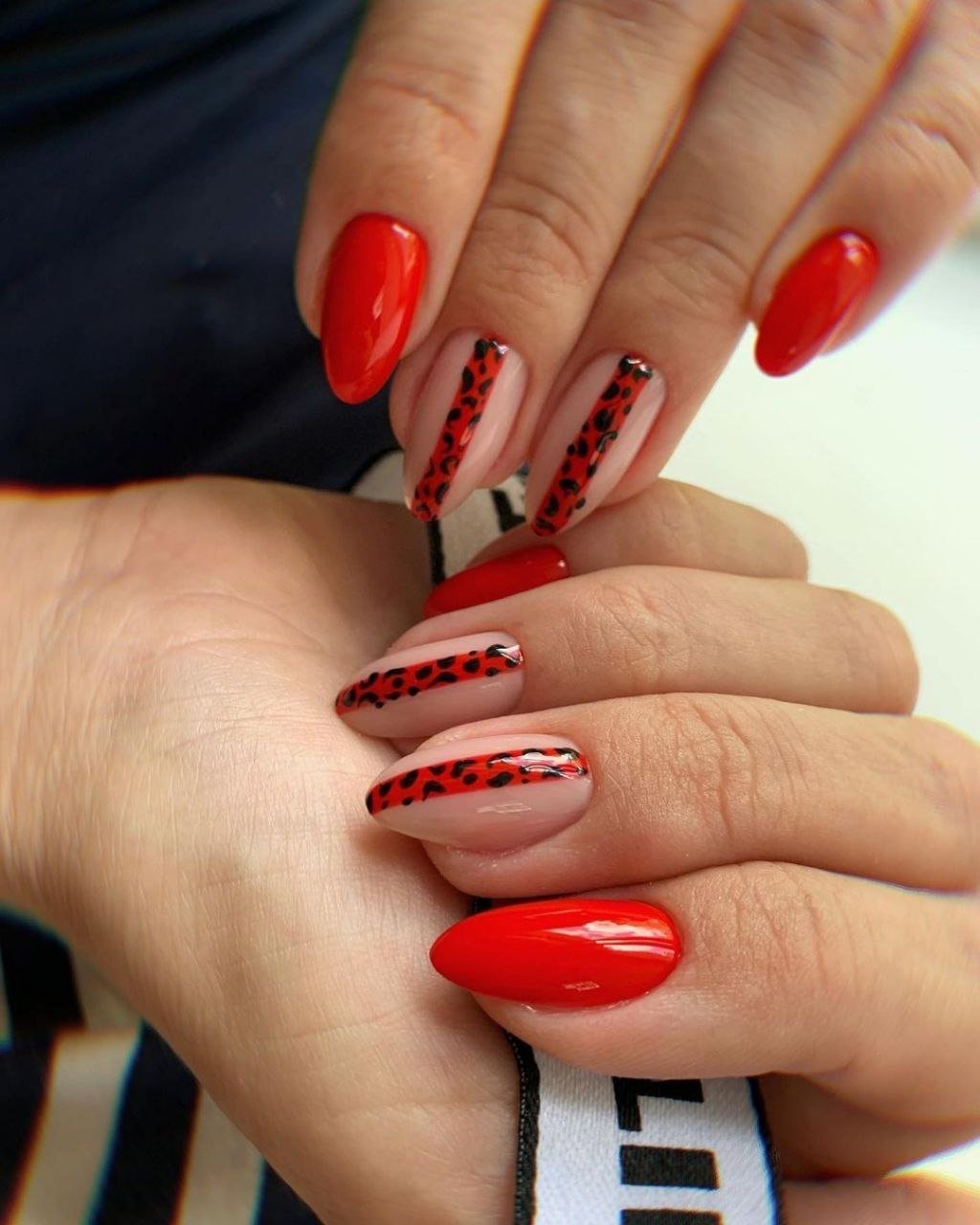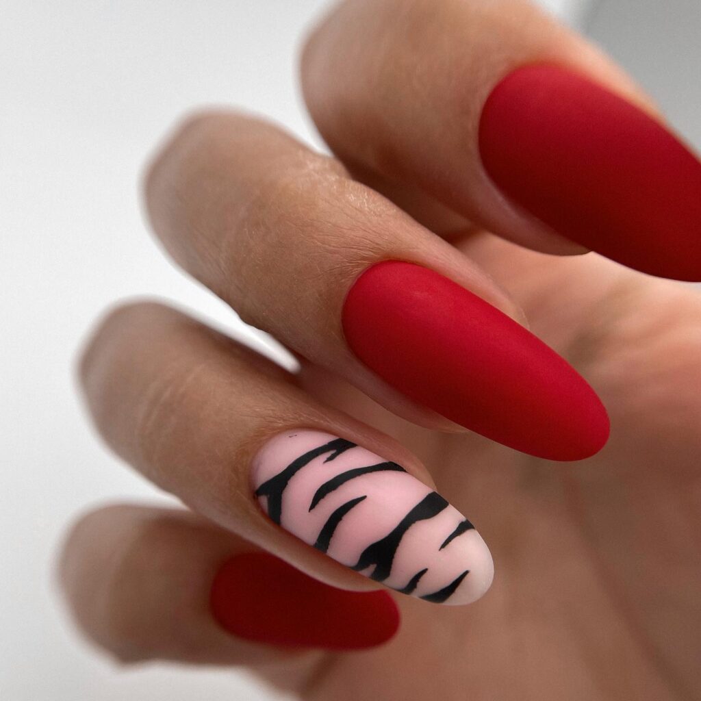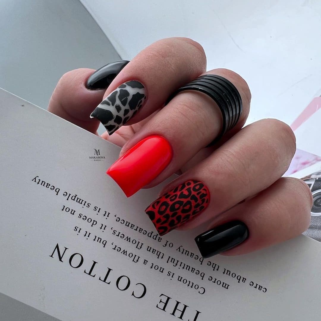 Сочетание животного принта и красного маникюра вам кажется чрезмерным? Вовсе нет, если к делу подойти с умом. Особенно актуальным в этом сезоне считается леопардовый принт. Но не стоит окрашивать все ноготки в яркую леопардовую расцветку. Выбирайте спокойные красные тона и дополняйте небольшими животными акцентами. Чтобы немного приглушить 2 активных приема в маникюре — красный цвет и леопардовый принт — используйте матовую текстуру.