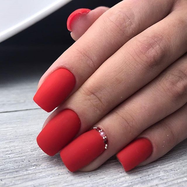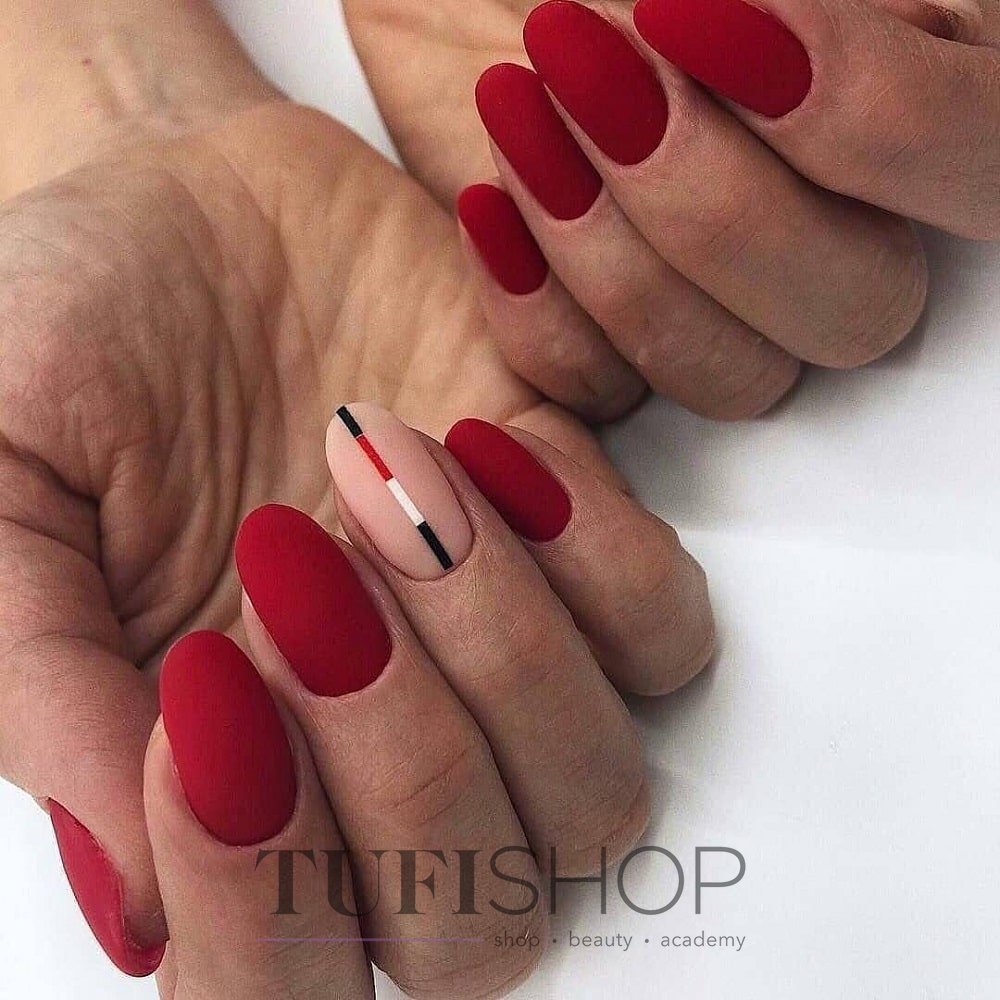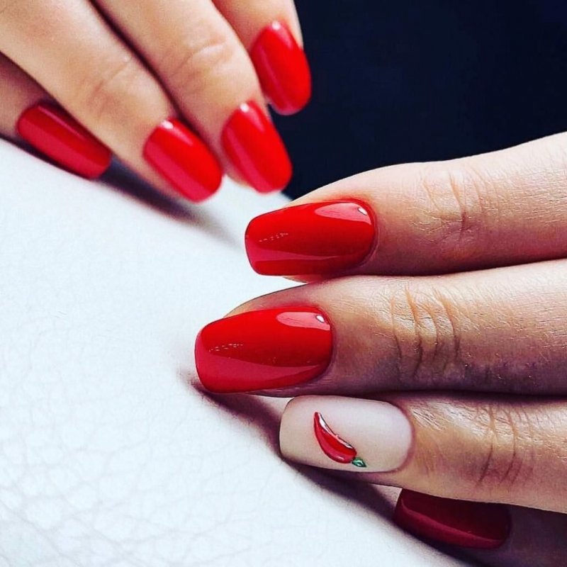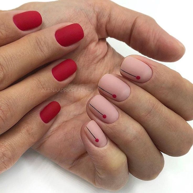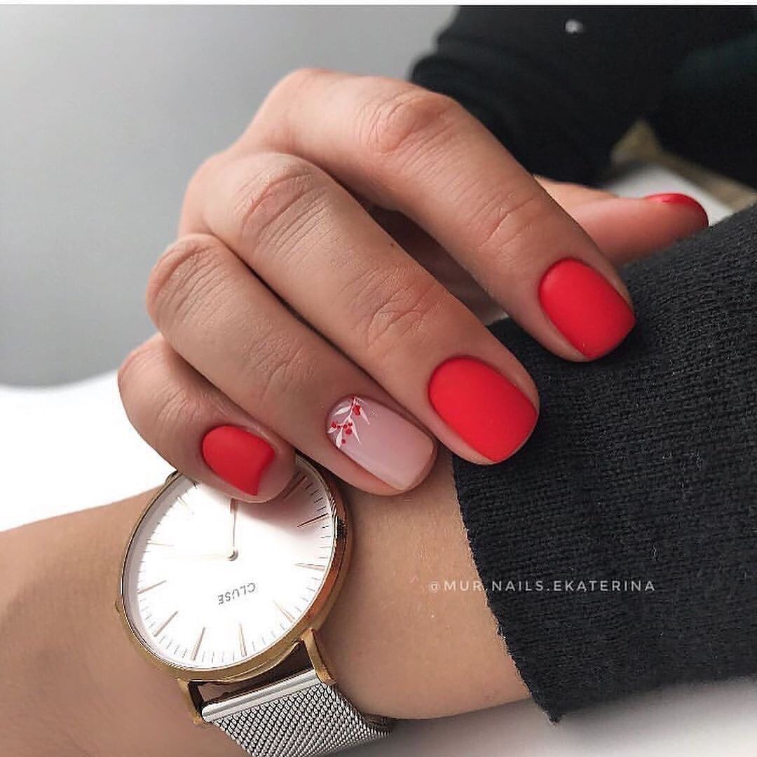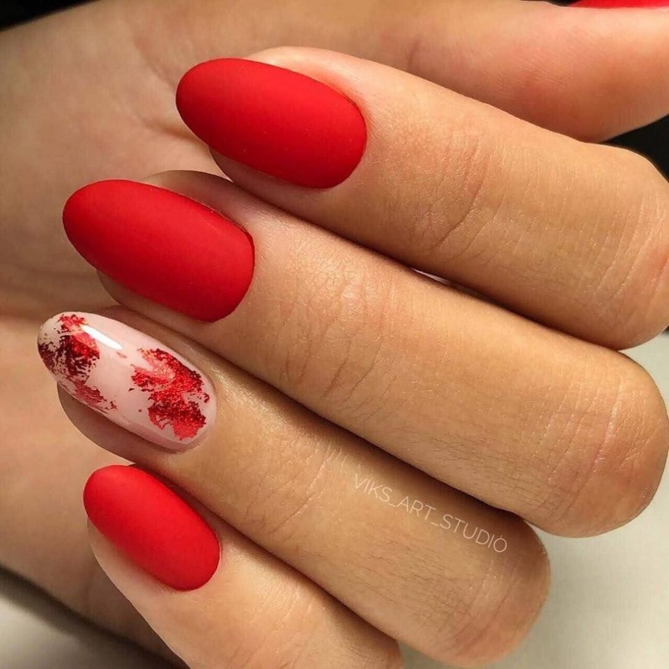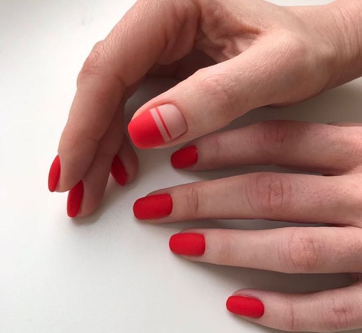 Матовая текстура актуальна, как никогда. Конечно, глянцевая не сдает своих позиций, но матовая делает красные ноготки более стильными и очень ухоженными. Маникюр выглядит дорого. Если вы не можете определиться, какую текстуру выбрать, отдайте предпочтение матовой. Но для создания более эффектного дизайна мы рекомендуем сочетать сразу две — глянцевую и матовую. Например, чередованием или сделать маникюр в стиле разные руки. Когда ногти на одной руке оформлены глянцевым топом, а на другой — сделано матовое покрытие.