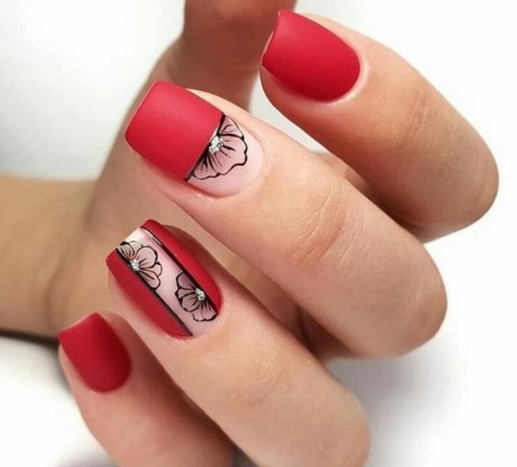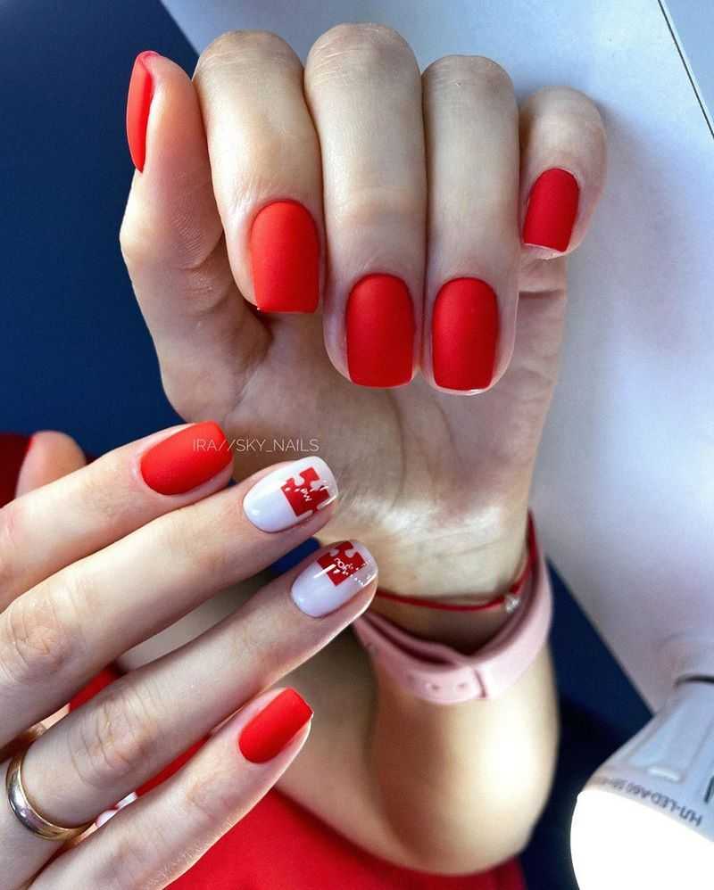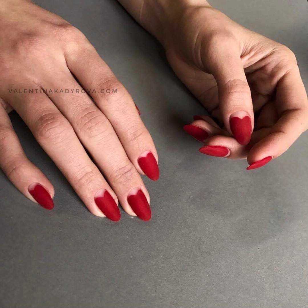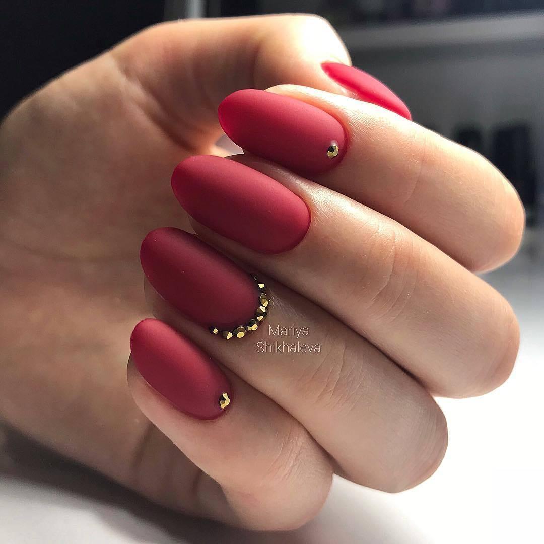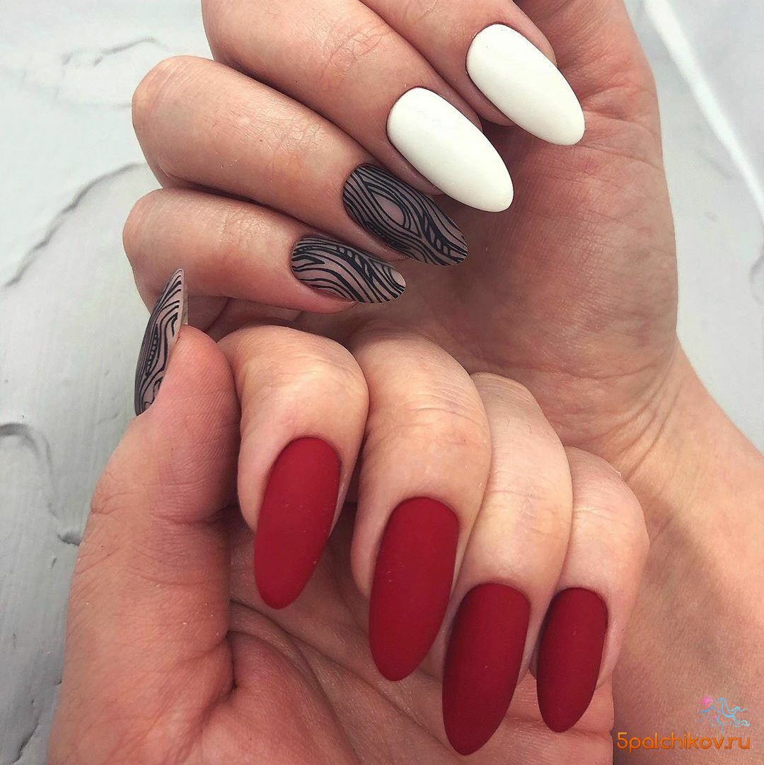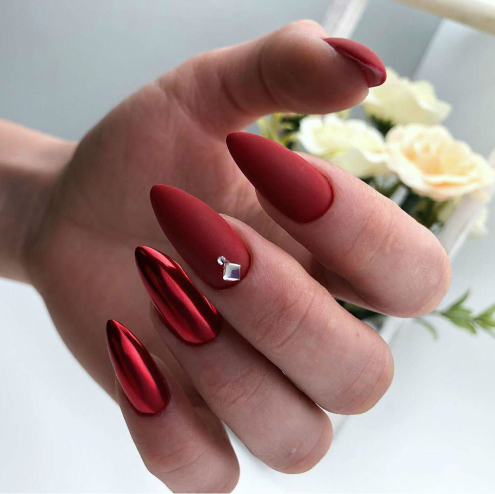 Матовая текстура актуальна, как никогда. Конечно, глянцевая не сдает своих позиций, но матовая делает красные ноготки более стильными и очень ухоженными. Маникюр выглядит дорого. Если вы не можете определиться, какую текстуру выбрать, отдайте предпочтение матовой. Но для создания более эффектного дизайна мы рекомендуем сочетать сразу две — глянцевую и матовую. Например, чередованием или сделать маникюр в стиле разные руки. Когда ногти на одной руке оформлены глянцевым топом, а на другой — сделано матовое покрытие.