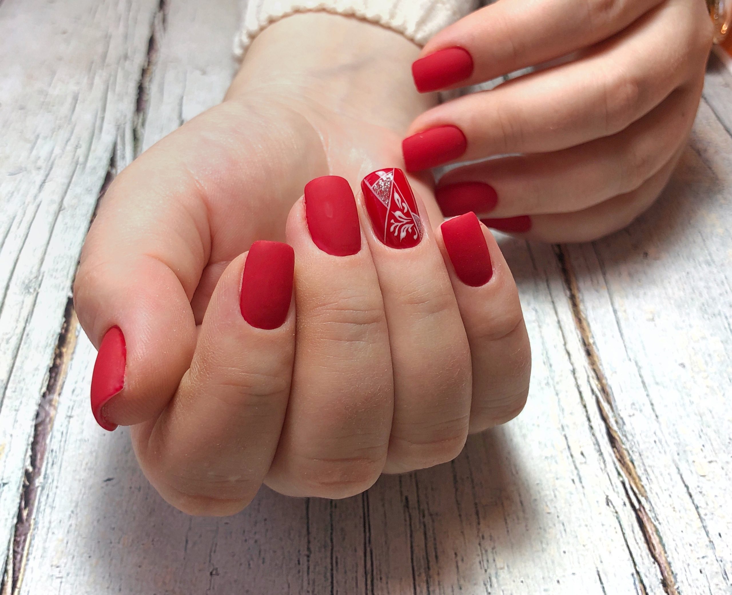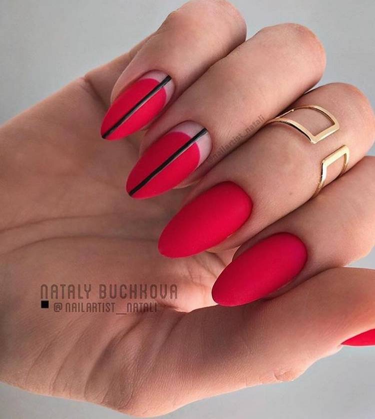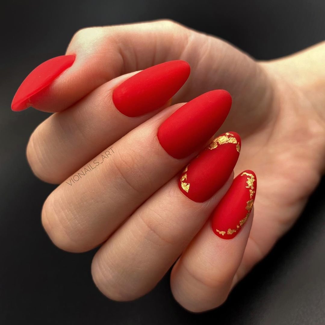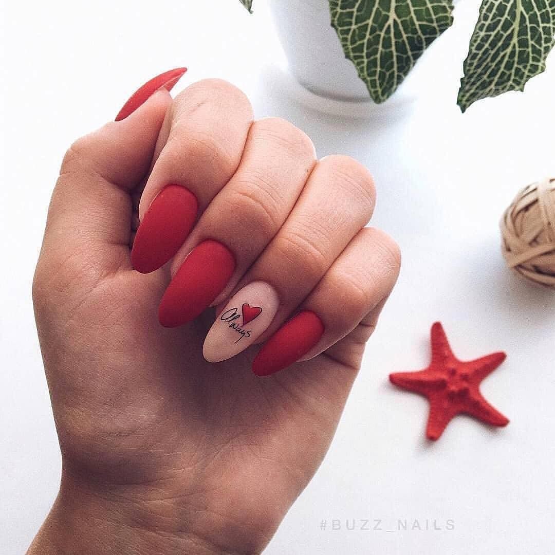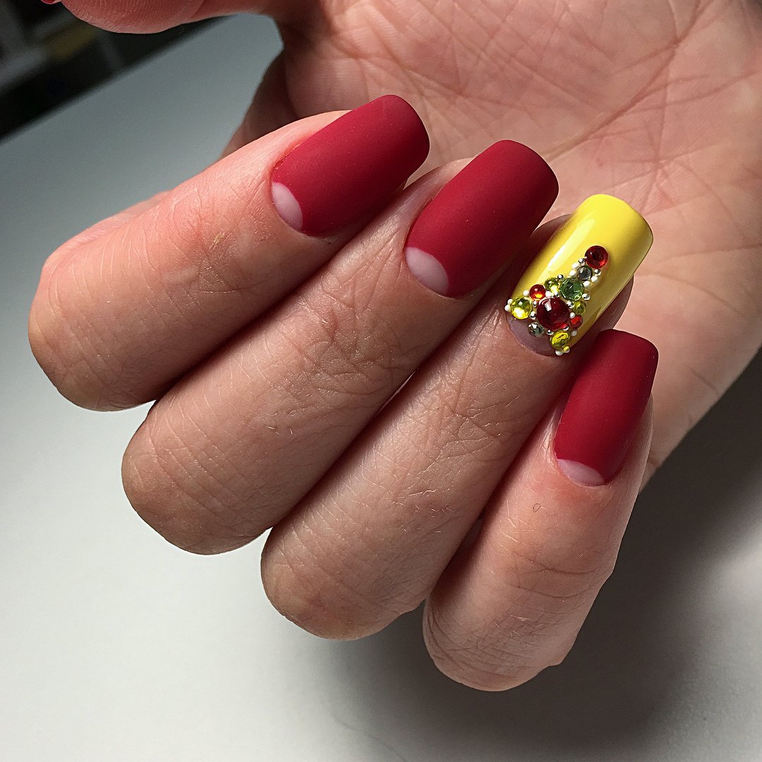 Матовая текстура актуальна, как никогда. Конечно, глянцевая не сдает своих позиций, но матовая делает красные ноготки более стильными и очень ухоженными. Маникюр выглядит дорого. Если вы не можете определиться, какую текстуру выбрать, отдайте предпочтение матовой. Но для создания более эффектного дизайна мы рекомендуем сочетать сразу две — глянцевую и матовую. Например, чередованием или сделать маникюр в стиле разные руки. Когда ногти на одной руке оформлены глянцевым топом, а на другой — сделано матовое покрытие.