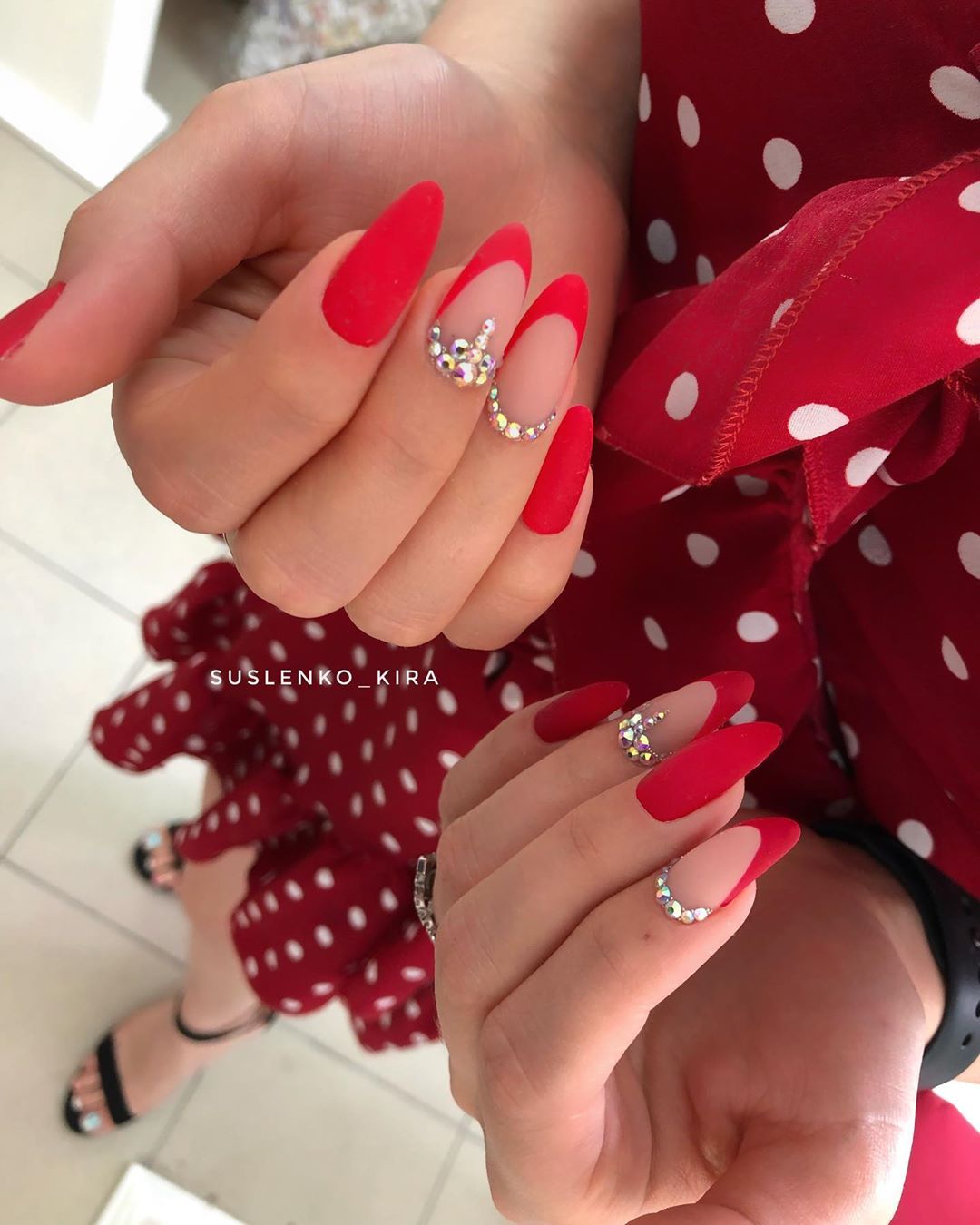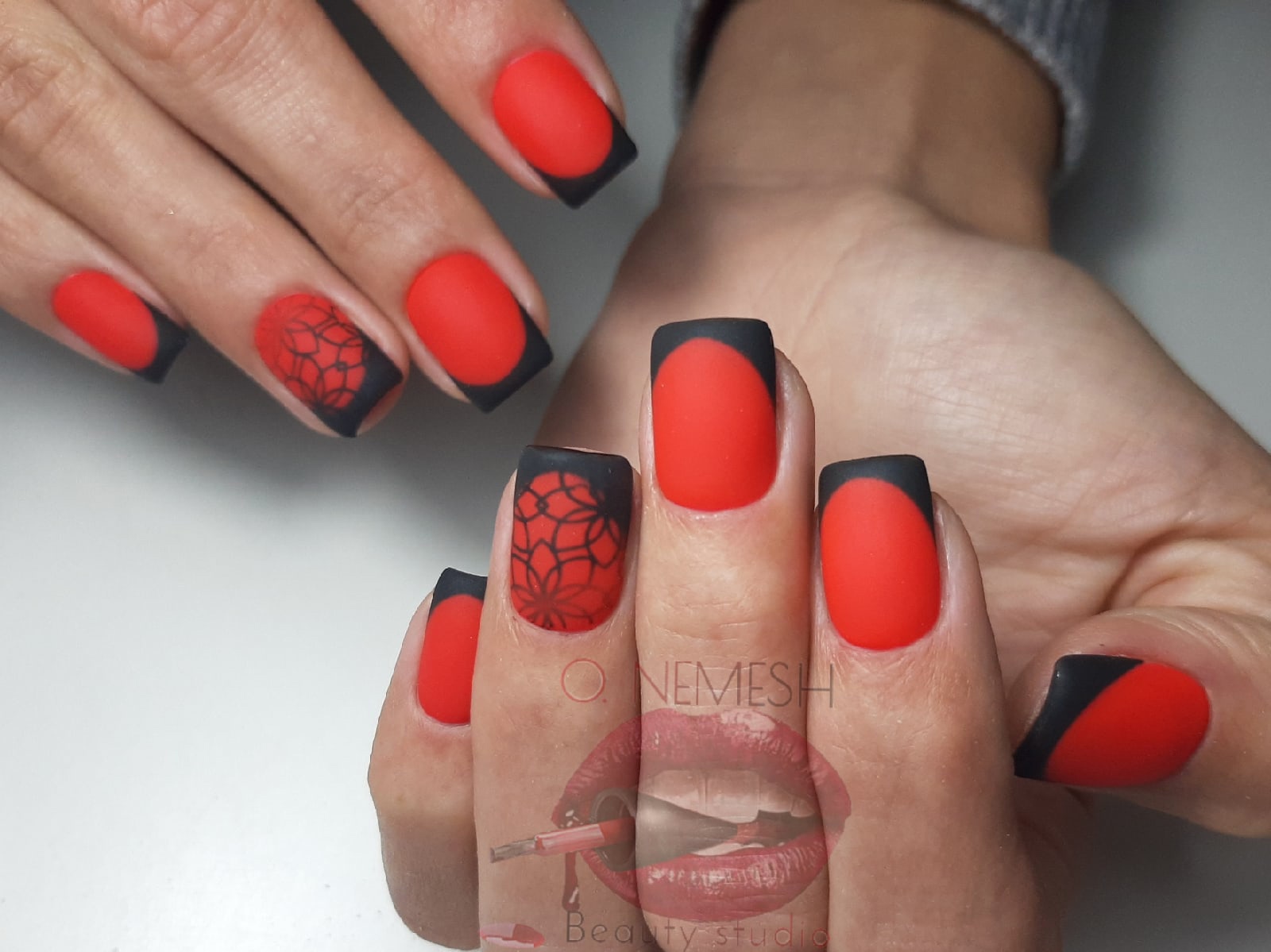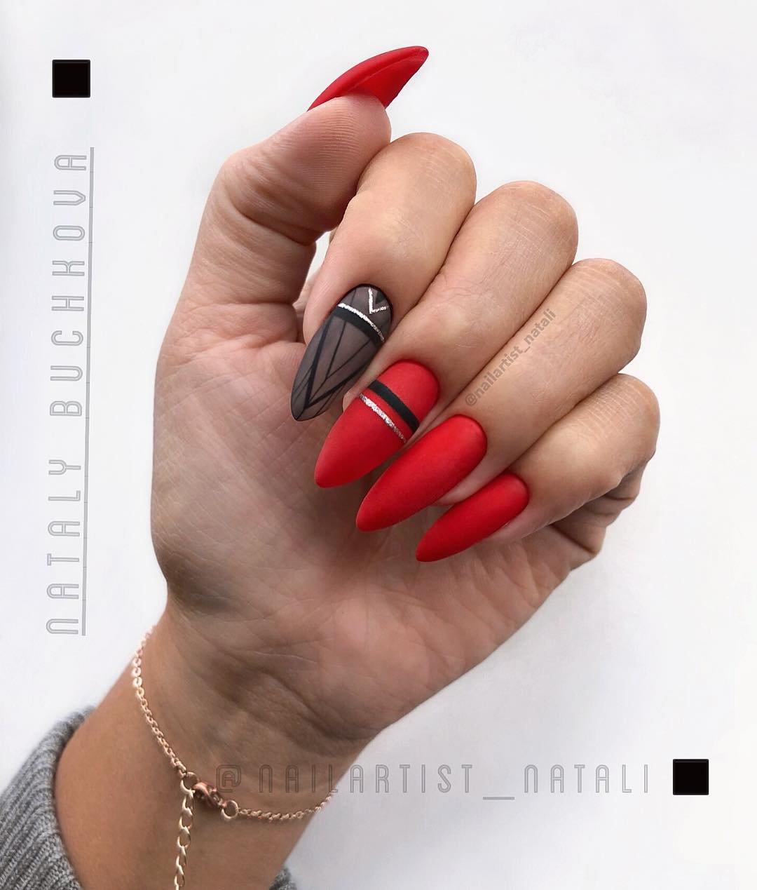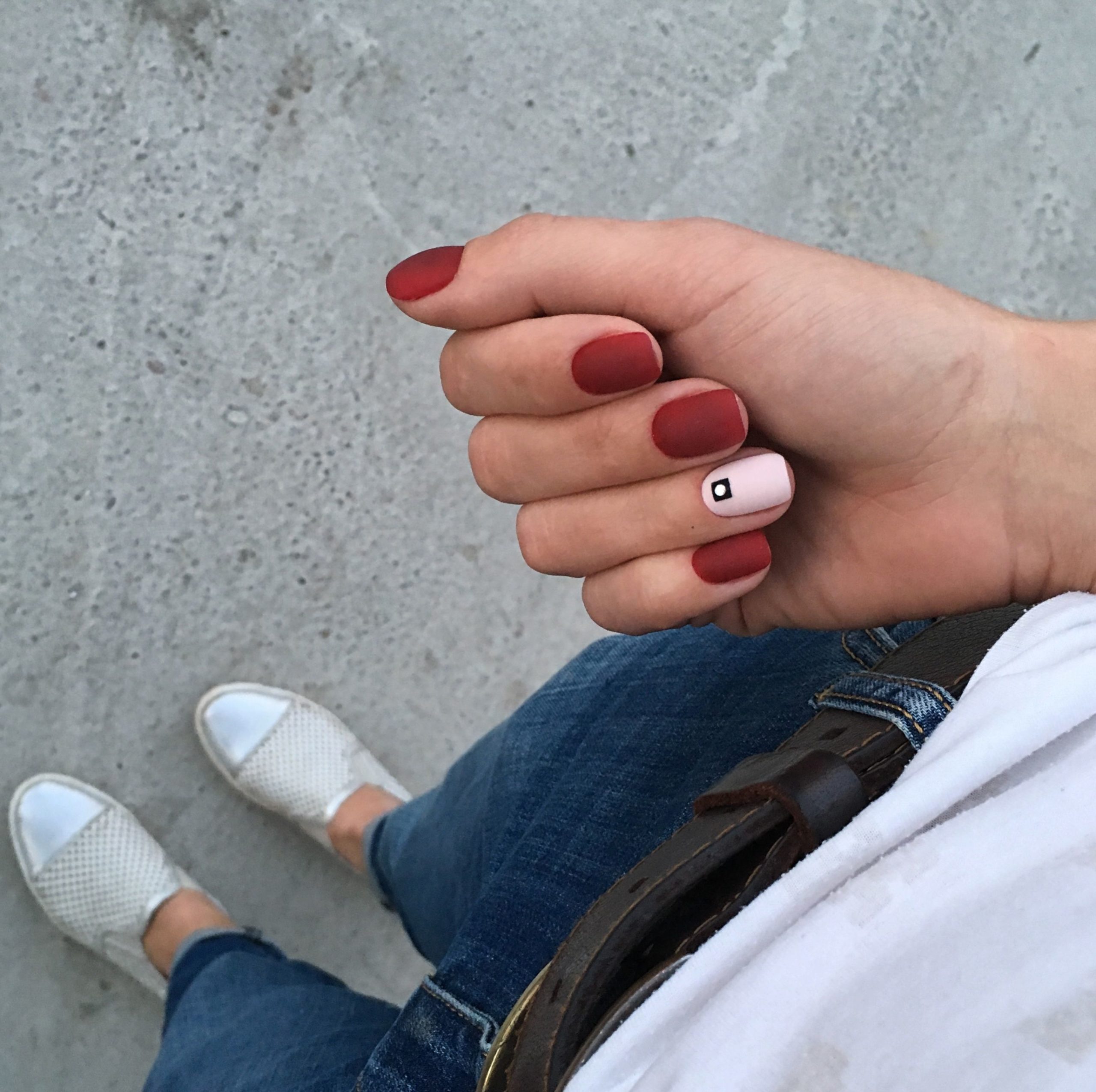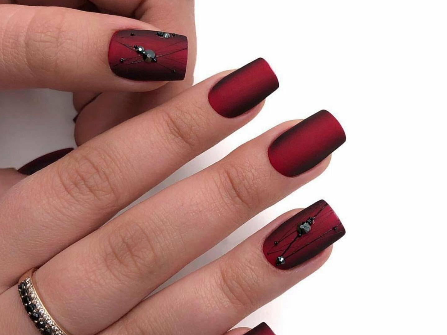 Матовая текстура актуальна, как никогда. Конечно, глянцевая не сдает своих позиций, но матовая делает красные ноготки более стильными и очень ухоженными. Маникюр выглядит дорого. Если вы не можете определиться, какую текстуру выбрать, отдайте предпочтение матовой. Но для создания более эффектного дизайна мы рекомендуем сочетать сразу две — глянцевую и матовую. Например, чередованием или сделать маникюр в стиле разные руки. Когда ногти на одной руке оформлены глянцевым топом, а на другой — сделано матовое покрытие.